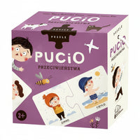Dwuelementowe puzzle dla dzieci od 2 lat zawierające 20 elementów podzielonych na 10 par obrazków. Zadanie polega na dopasowaniu przeciwieństw: mały–duży, stare–nowe, mokra–sucha, zdrowy–chory, smutny–wesoły, głodny–najedzony, lekkie–ciężkie, zimno–ciepło, cicho–głośno, brudny–czysty. Gra rozwija zdolności obserwacyjne i logiczne myślenie poprzez analizę ilustracji. Pomimo prostej formy puzzle oferuje wiele wariantów zabawy dostosowanych do poziomu rozwojowego dziecka. Projekt autorski Marty Galewskiej-Kustra, pedagożki i logopedy, oraz Joanny Kłos, ilustratorki i projektantki.