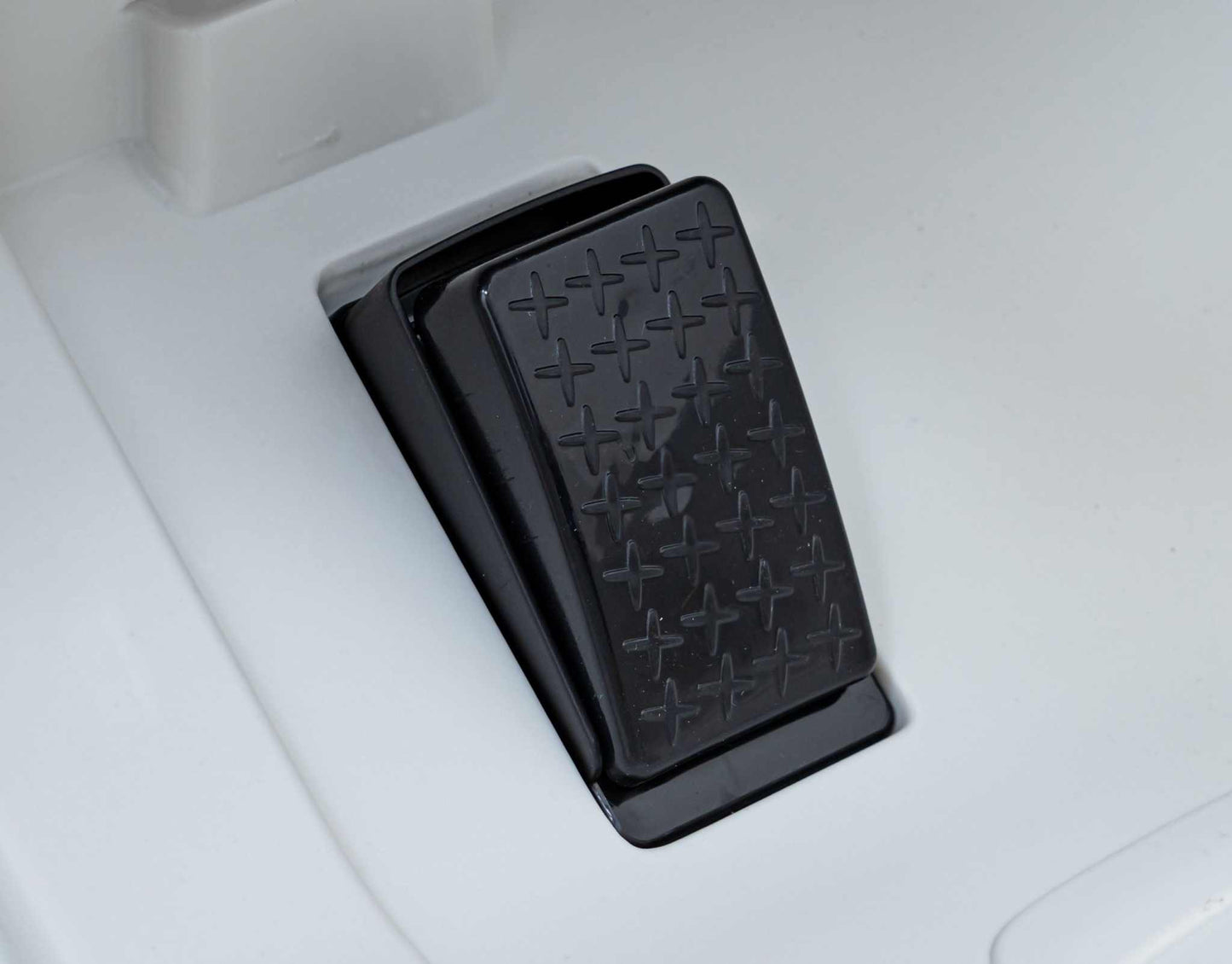 - Wykorzystuje wytrzymałe materiały: EVA na kołach i ekoskórę na siedzeniu, łatwe w czyszczeniu.