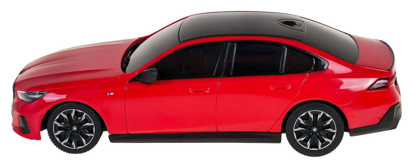 - Odwzorowuje precyzyjnie stylistykę BMW i5 — od przodu przez dach po tylne lampy, w intensywnym czerwonym lakierze.