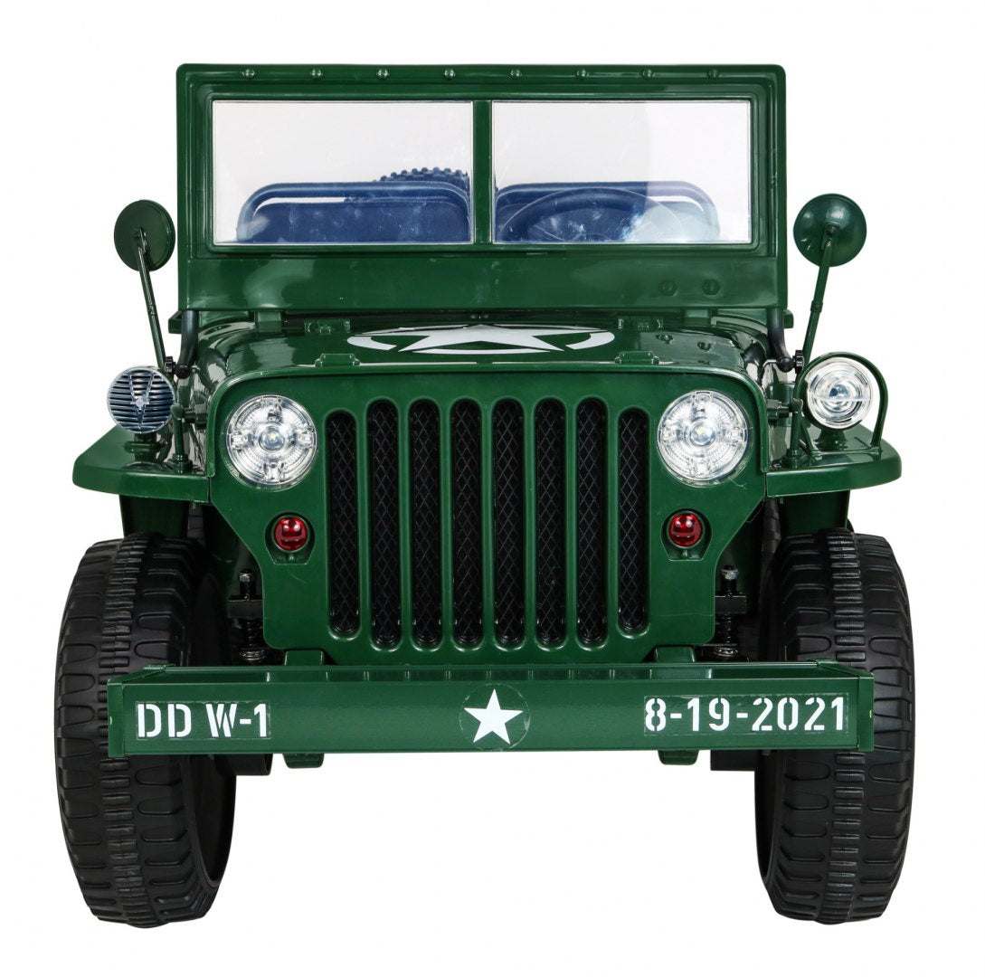Autko Wojskowe Retro 4x4 dla 3 dzieci – Zielony Jeep Willys łączy klasyczny design z nowoczesną technologią, zapewniając bezpieczną i pełną przygód zabawę w ogrodzie i na podwórku. Dzięki solidnej konstrukcji i możliwości wspólnej jazdy trzech młodych kierowców tworzy wyjątkową, retro atmosferę militarnego stylu.
