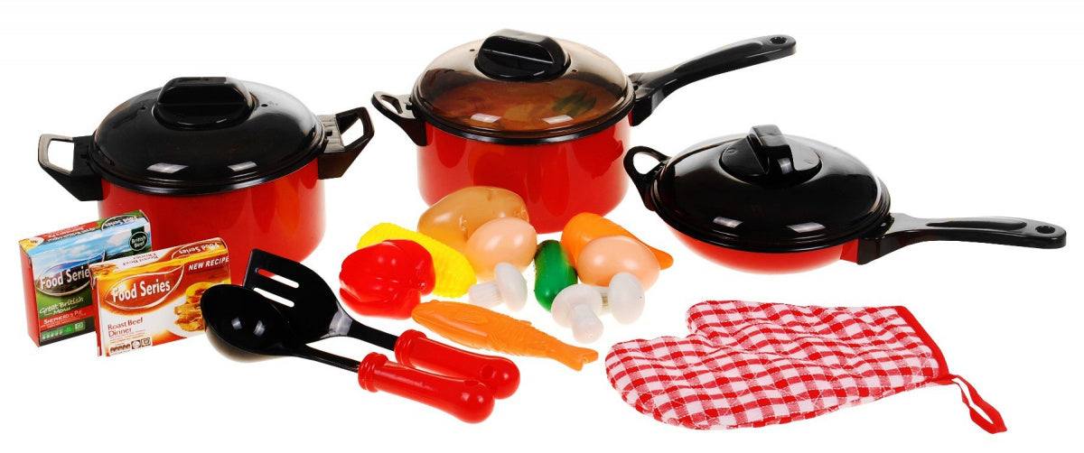- 22 elementy obejmujące garnki, przybory kuchenne i atrapy jedzenia