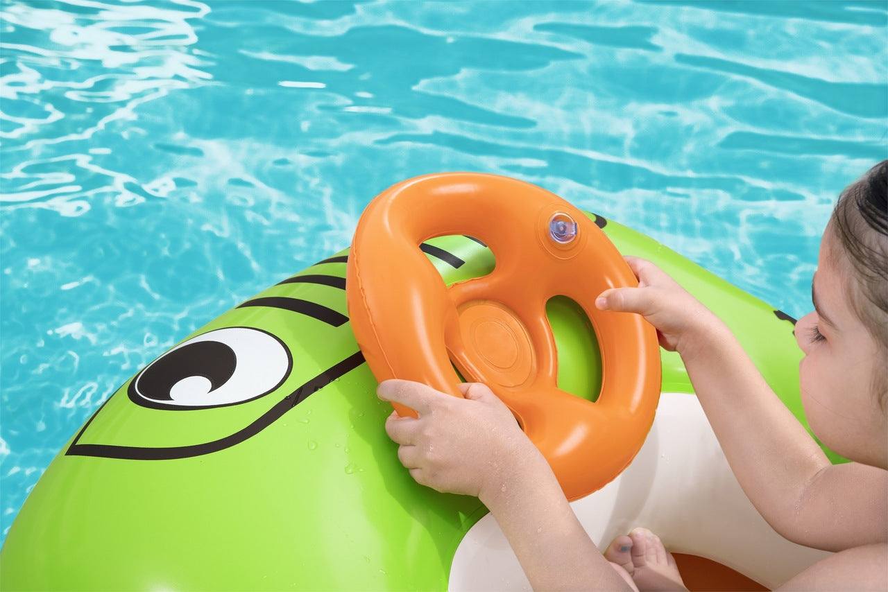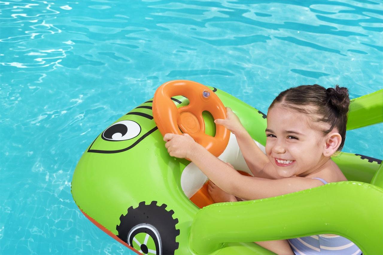Ponadź wodne przygody swoim małym odkrywcom dzięki Dmuchanemu Pontonowi do pływania – Autko dla dzieci 3+. Produkt Bestway, dostępny w ofercie Minika, 109 x 94 cm, wykonany z wytrzymałego winylu o grubości 0,24 mm. Nadmuchiwana podłoga zapewnia komfort, a ruchoma kierownica dodaje zabawie realizmu. Bezpieczna konstrukcja i przemyślane detale zachęcają do aktywności w wodzie na basenie, jeziorze i innych rekreacyjnych akwenach.