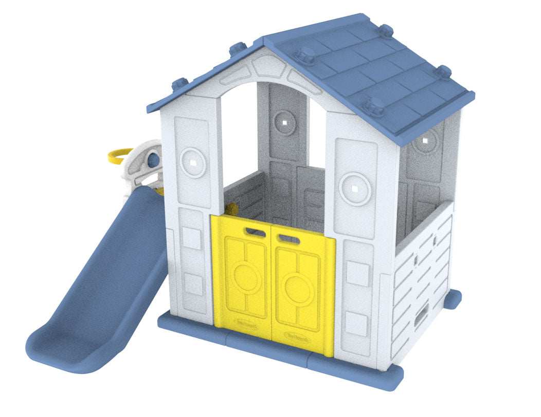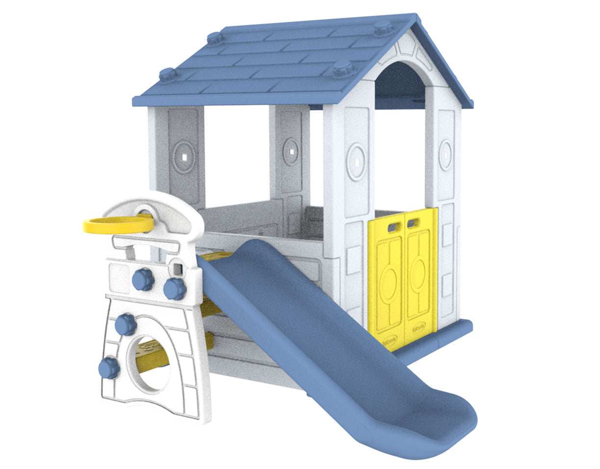 - Gromadzi trzy atrakcje w jednym zestawie: domek, zjeżdżalnię i koszykówkę, zachęcające do aktywności na świeżym powietrzu.