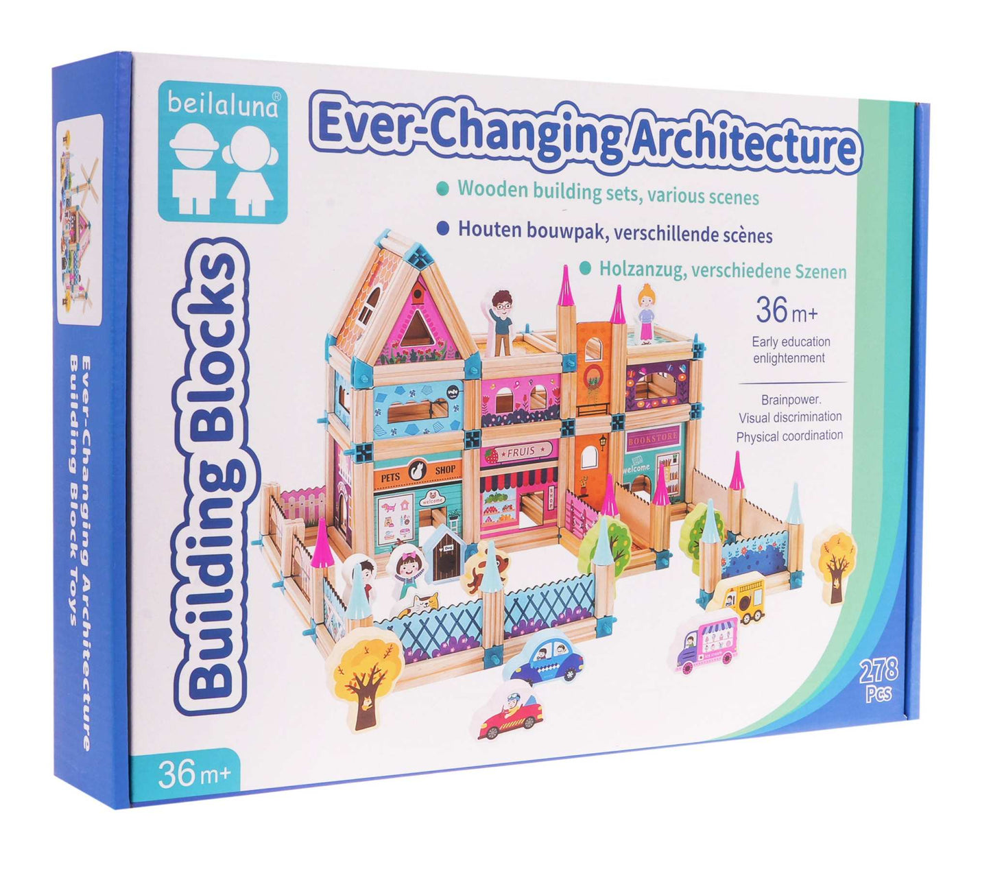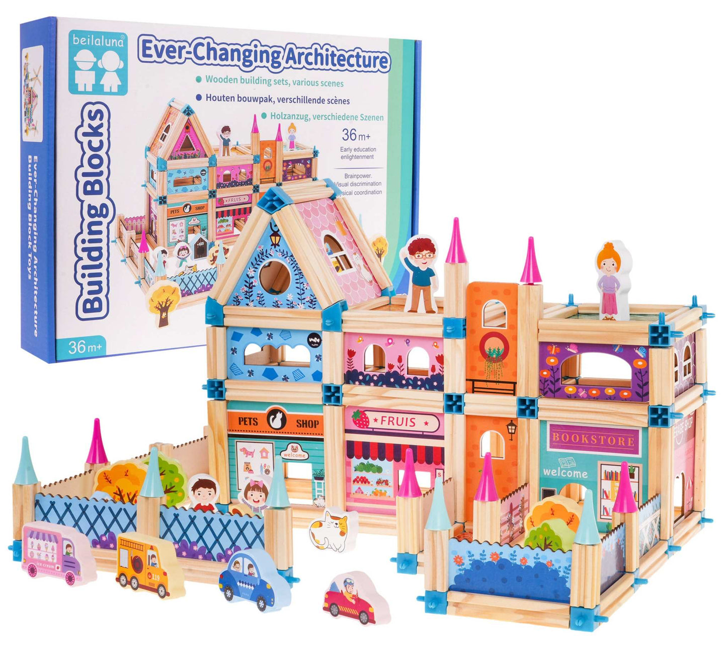 - Buduj z 278 elementów – drewniane klocki, łączniki i figurki tworzą kolorowy, trwały zamek.