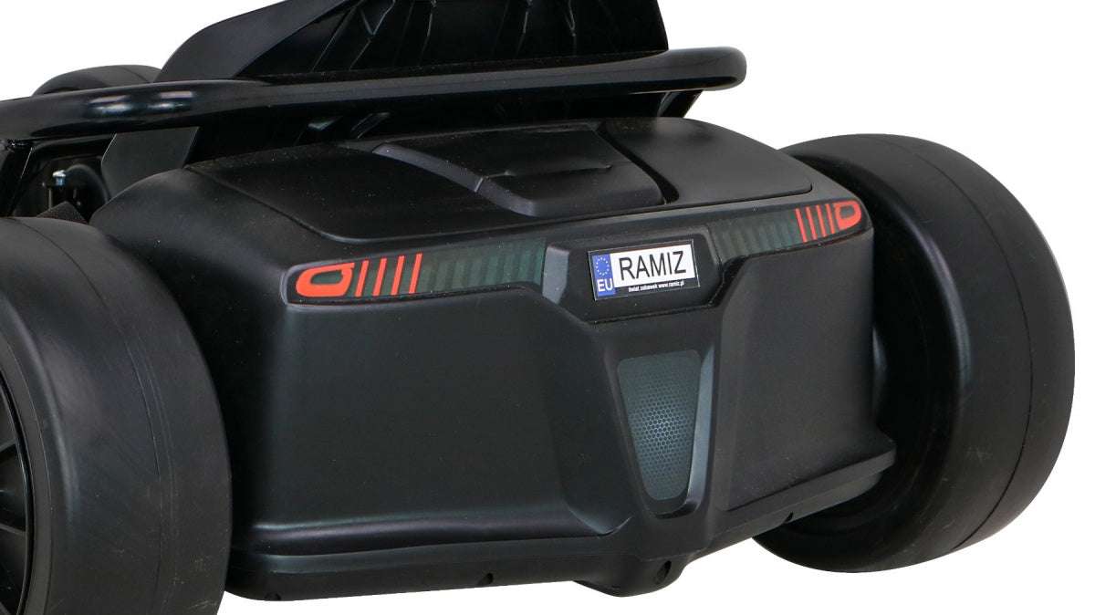 - Wyposażono w podwójny akumulator 12V/9Ah, co umożliwia dłuższą zabawę bez częstych ładowań.