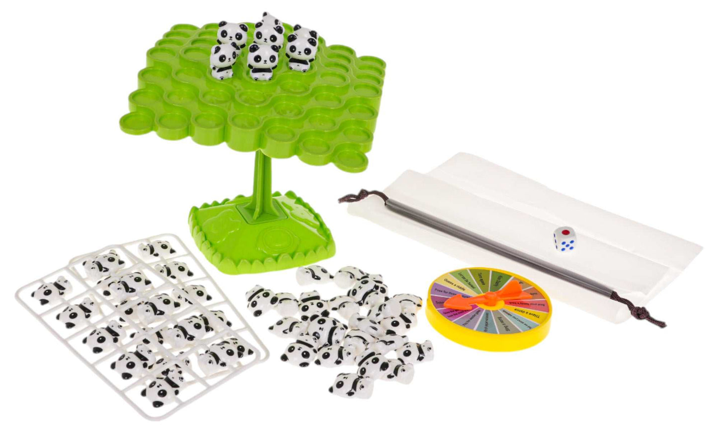 Dopasowanie: Zabawka dopasowana do rąk dzieci od 3 lat; łatwa do chwytania i obsługi; wykonana z bezpiecznych materiałów; zestaw zawiera podstawkę, słupek, planszę, figurki pand, kostkę i koło z zadaniami.