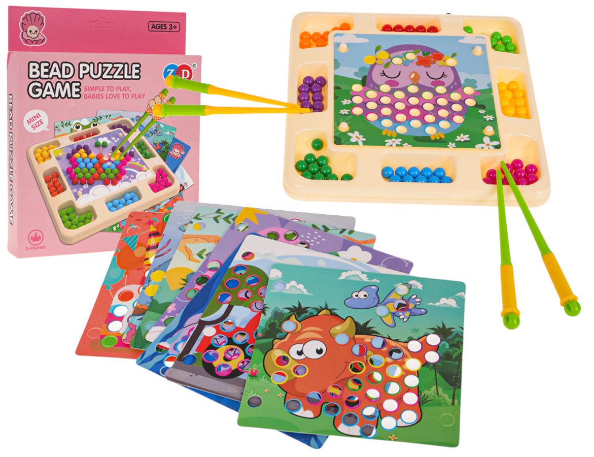 - Układaj koraliki po bokach planszy zgodnie z kolorami na kartach, tworząc pełne schematy.