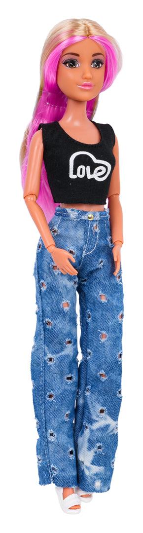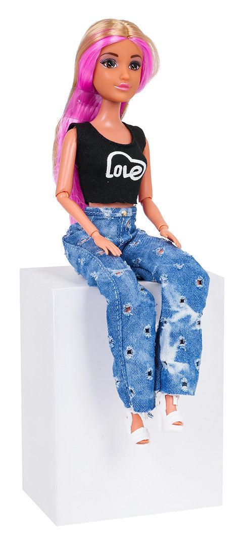 - Przebieraj lalkę dzięki zdejmowanym ubrankom (bluzka, spodnie) i butom na obcasie.