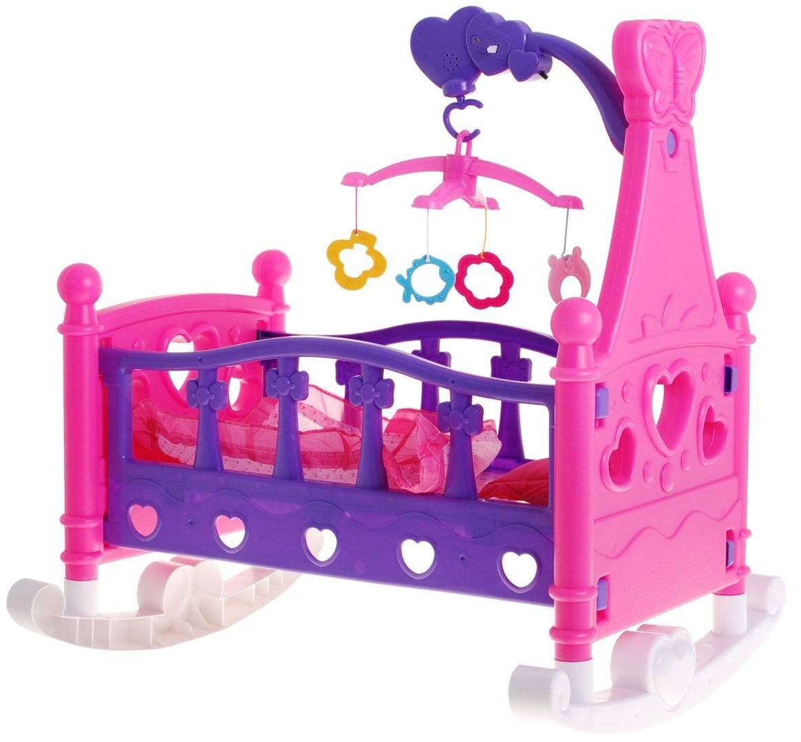 Łóżeczko Kołyska dla lalek 2w1 z karuzelą z dźwiękami i pościelą dla lalek – zabawa w dom