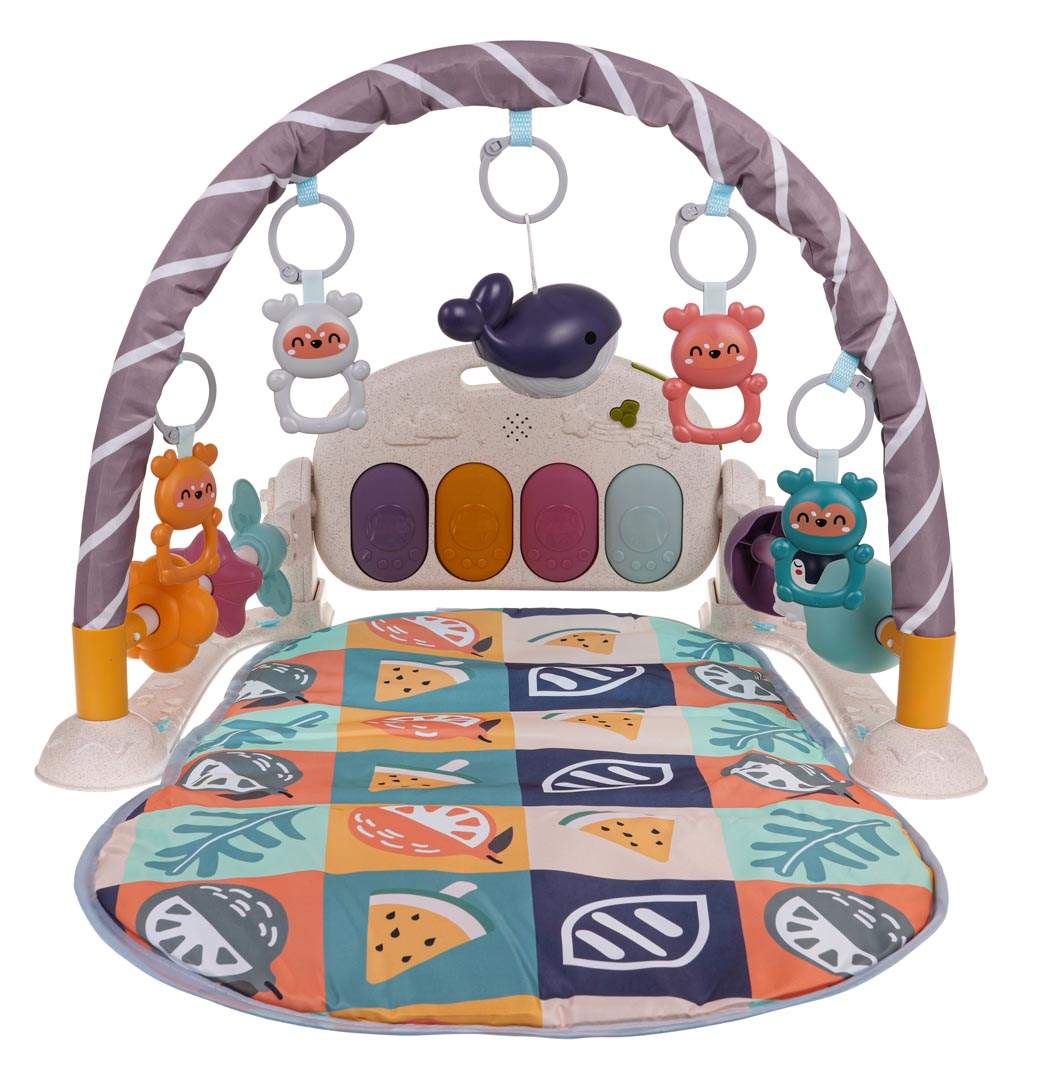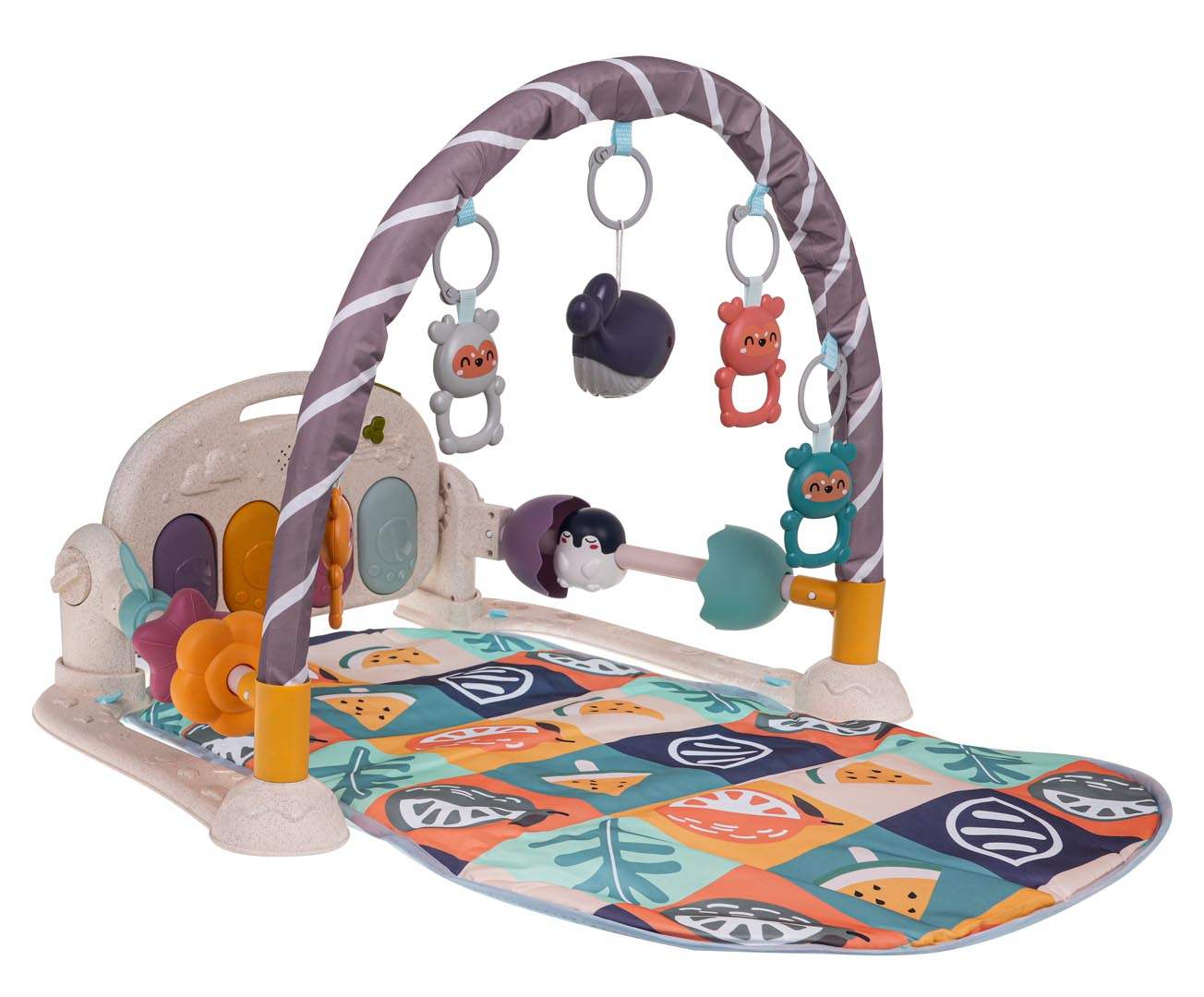 - Stymuluje zmysły dzięki pianinku oraz kolorowym zabawkom zawieszonym na pałąku.