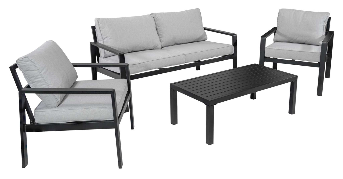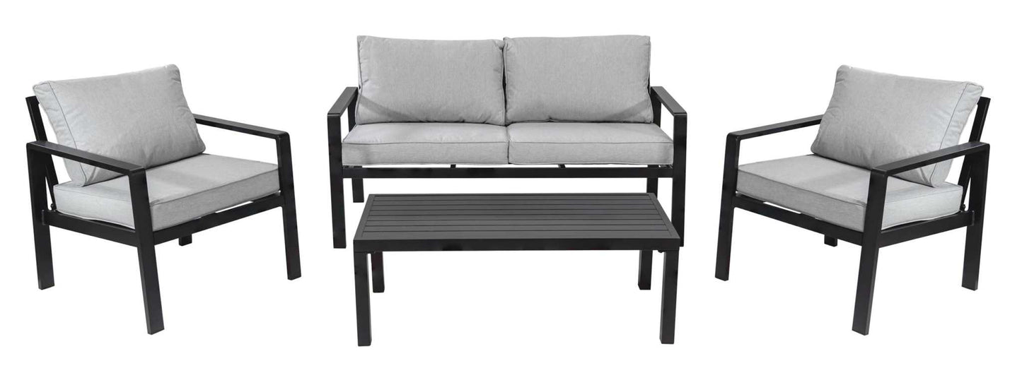 Care/fit: Zestaw jest przeznaczony do użytku na zewnątrz; aluminiowy stelaż nie koroduje i łatwo się czyści. Poduszki zapewniają komfort podczas długich chwil odpoczynku — dla zachowania ich wyglądu zaleca się ochronę przed intensywnym słońcem i, w razie potrzeby, czyszczenie zgodnie z instrukcjami producenta.