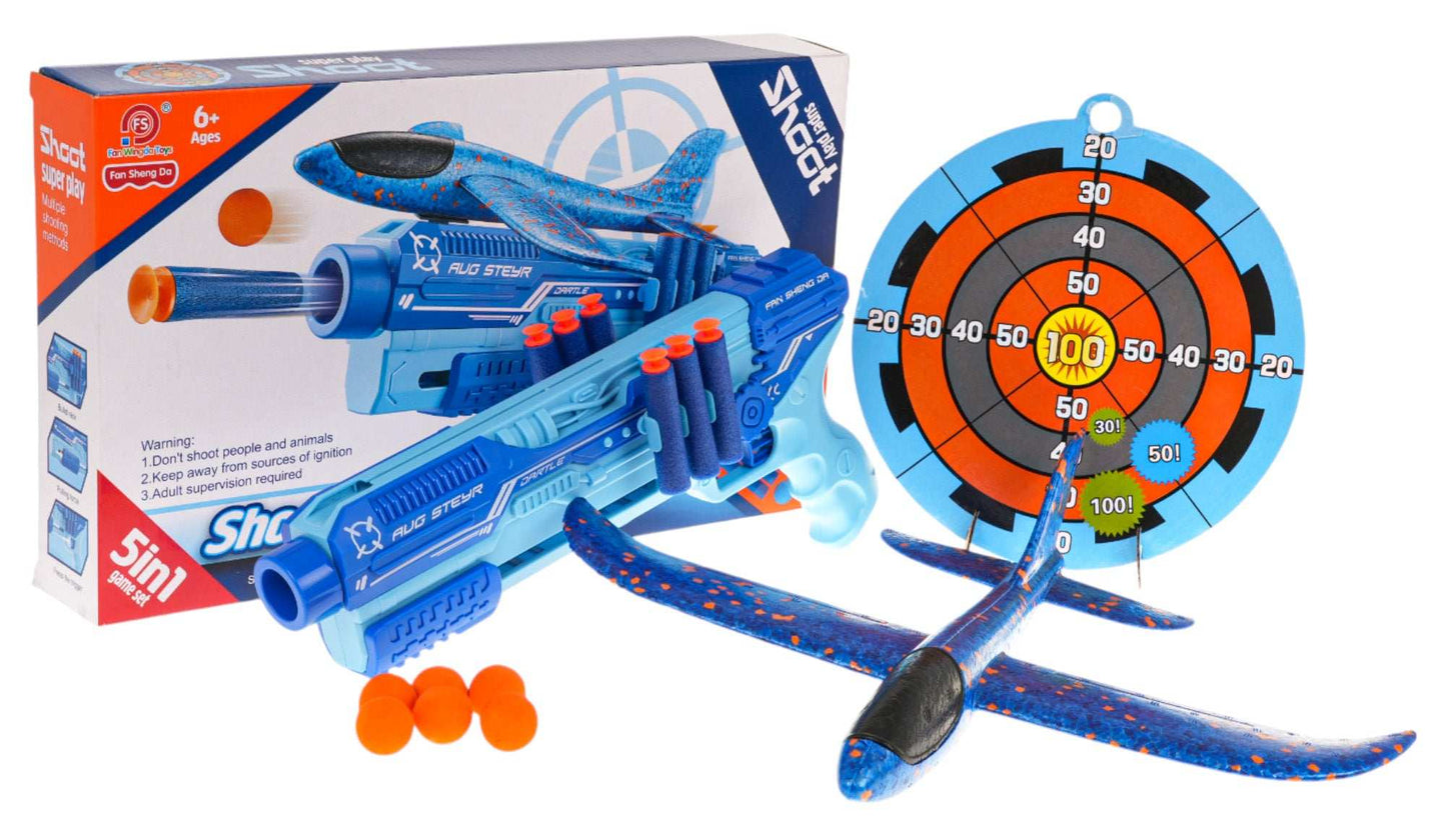 - Korzystaj z zestawu 5w1: pistolet na strzałki, piankowe pociski z przyssawką, piankowe kulki i mini samolot.