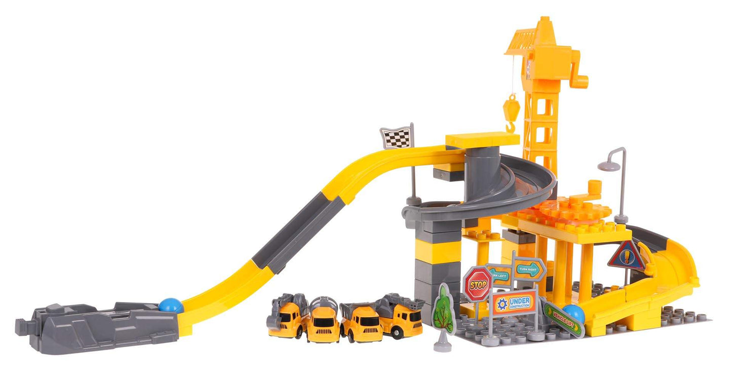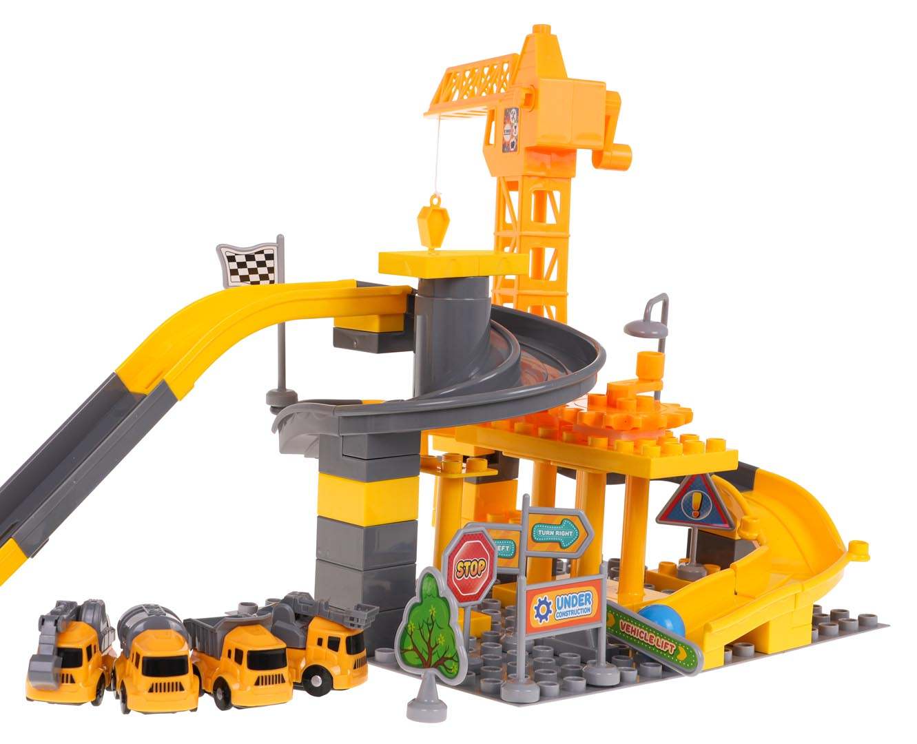 - Buduj dynamiczny plac budowy z autkami budowlanymi, zjeżdżalnią i ruchomym dźwigiem.