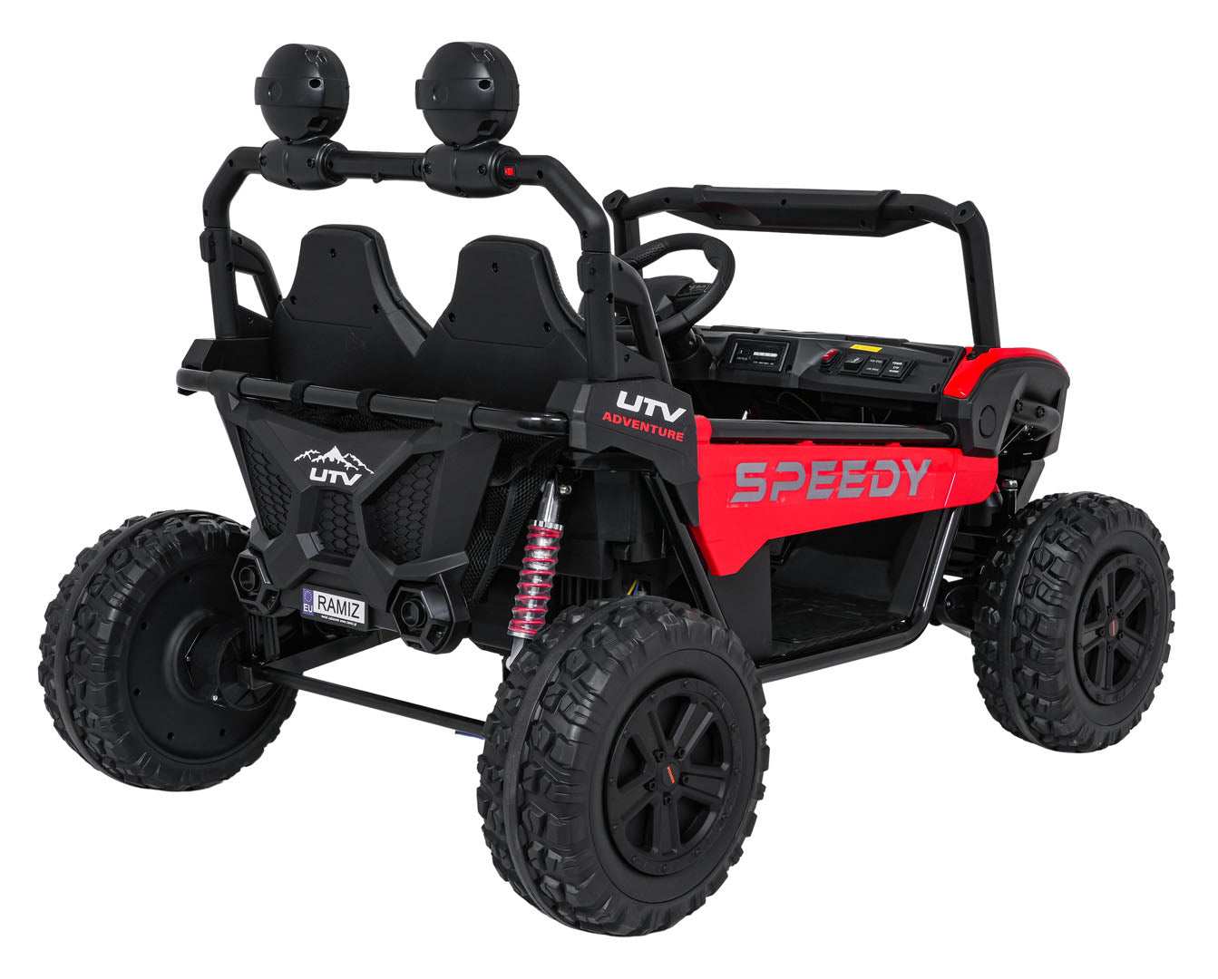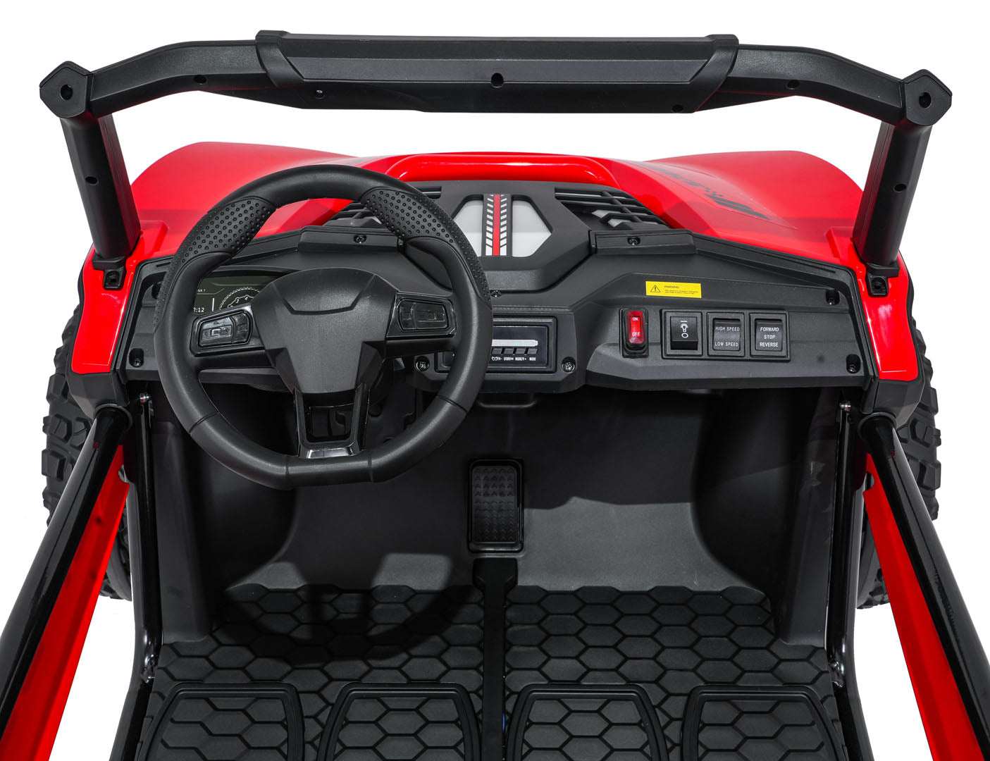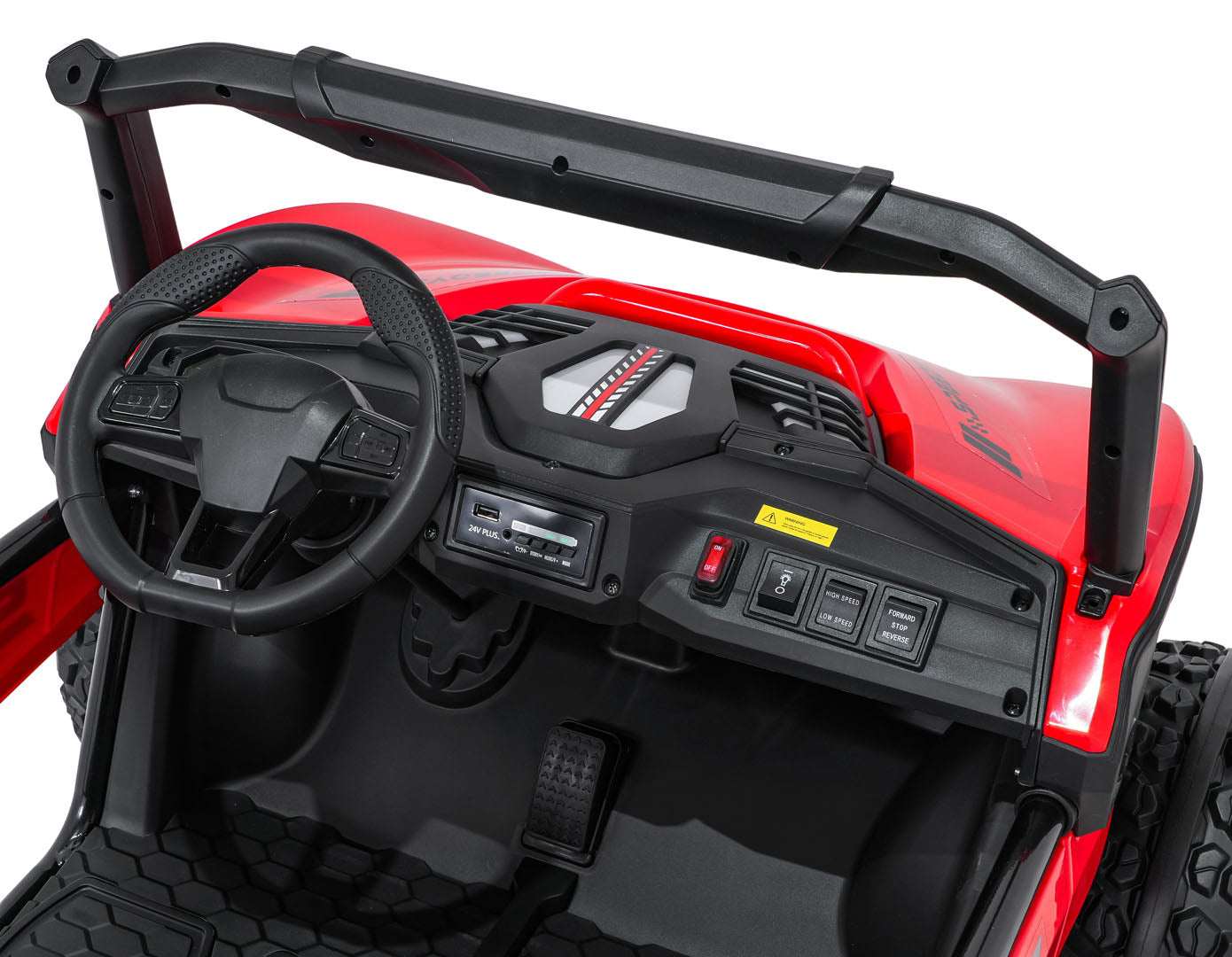SPEEDY Pojazd Buggy 4x4 Czerwony — terenowy, elektryczny buggy stworzony dla młodych miłośników motoryzacji. Dzięki napędowi 4x4 z dwoma silnikami 4x200W i realistycznemu designowi każda jazda staje się ekscytującą przygodą w ogrodzie i na bezpiecznych nawierzchniach. Mocne koła EVA zapewniają dobrą przyczepność, a LED-owe światła przednie i podświetlana maska dodają realizmu także o zmroku. Pilot zdalnego sterowania 2,4 GHz umożliwia rodzicom prowadzenie z bezpiecznej odległości, a trzy biegi z funkcją wolnego startu łagodzą ruszenie i dopasowują prędkość do umiejętności dziecka.
