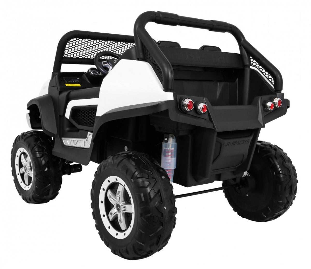 Mercedes Benz Unimog Pojazd Dla Dzieci Biały to bezpieczny, trwały i realistyczny pojazd elektryczny od Minika, zaprojektowany z myślą o młodych kierowcach. Autentyczny design Mercedesa Unimoga łączy się z wytrzymałą konstrukcją i komfortowym wnętrzem. Dzięki akumulatorowi 12V/14Ah oraz napędowi na dwa lub cztery silniki (4 x 10000 RPM) mali odkrywcy pokonają różne powierzchnie przy zapewnionej kontroli rodzica, przez zdalny pilot 2.4G. Trzy prędkości oraz wolny start gwarantują bezpieczne, płynne ruszenie, a koła EVA o średnicy 37 cm i tylne zawieszenie tłumią drgania podczas zabawy na nierównościach.
