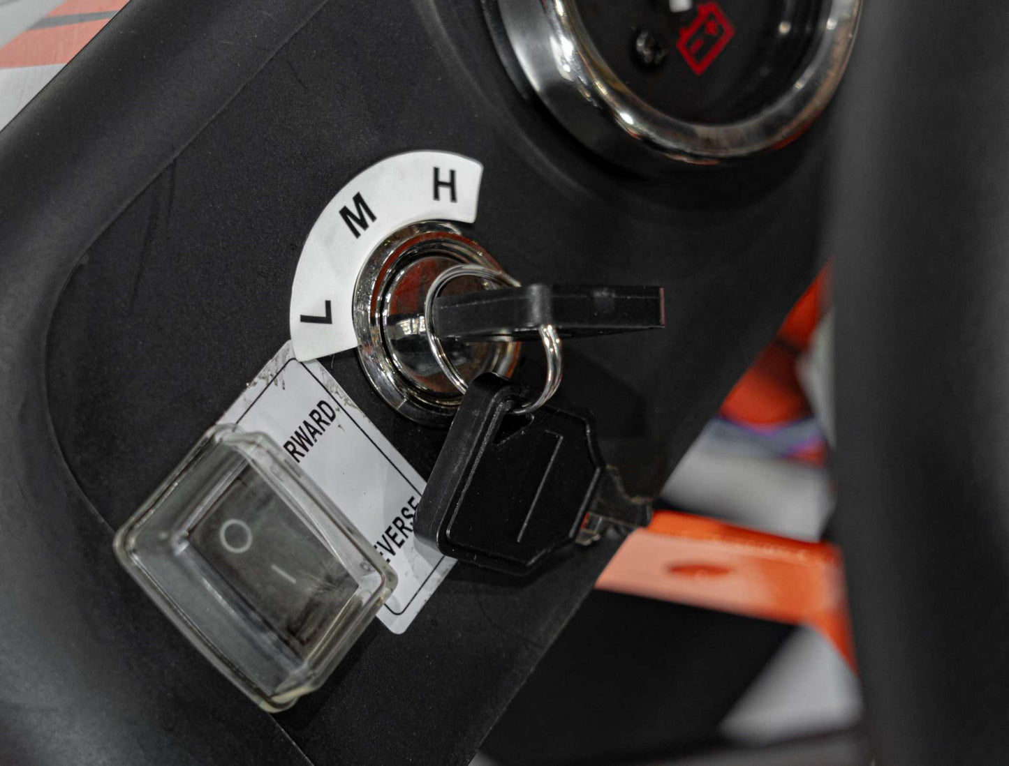 - Zabezpiecza zabawę dzięki kluczykowi i praktycznemu przyciskowi zmiany kierunku (przód/tył).