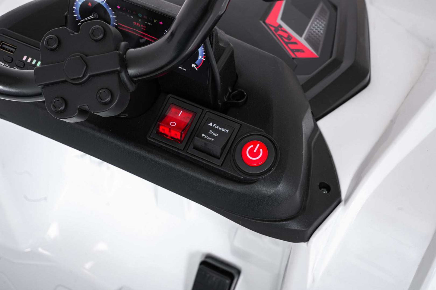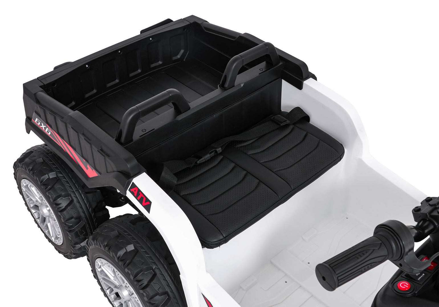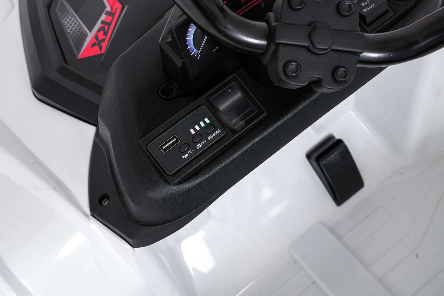 - Zapewnia komfort jazdy dzięki oponom EVA 26x11 cm i 2 amortyzatorom z przodu oraz 4 z tyłu, a także panelowi MP3/Bluetooth do muzyki.