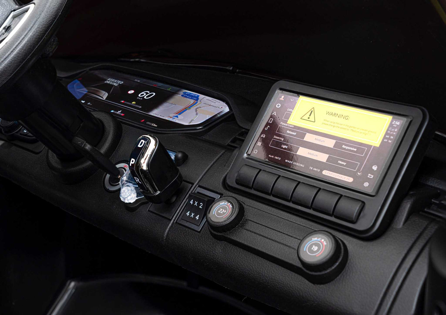 - Przełączaj napęd między trybem 4x4 a 2x2, by dopasować trakcję do nawierzchni.