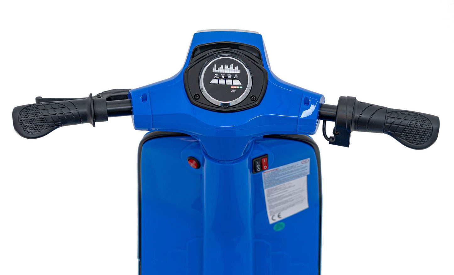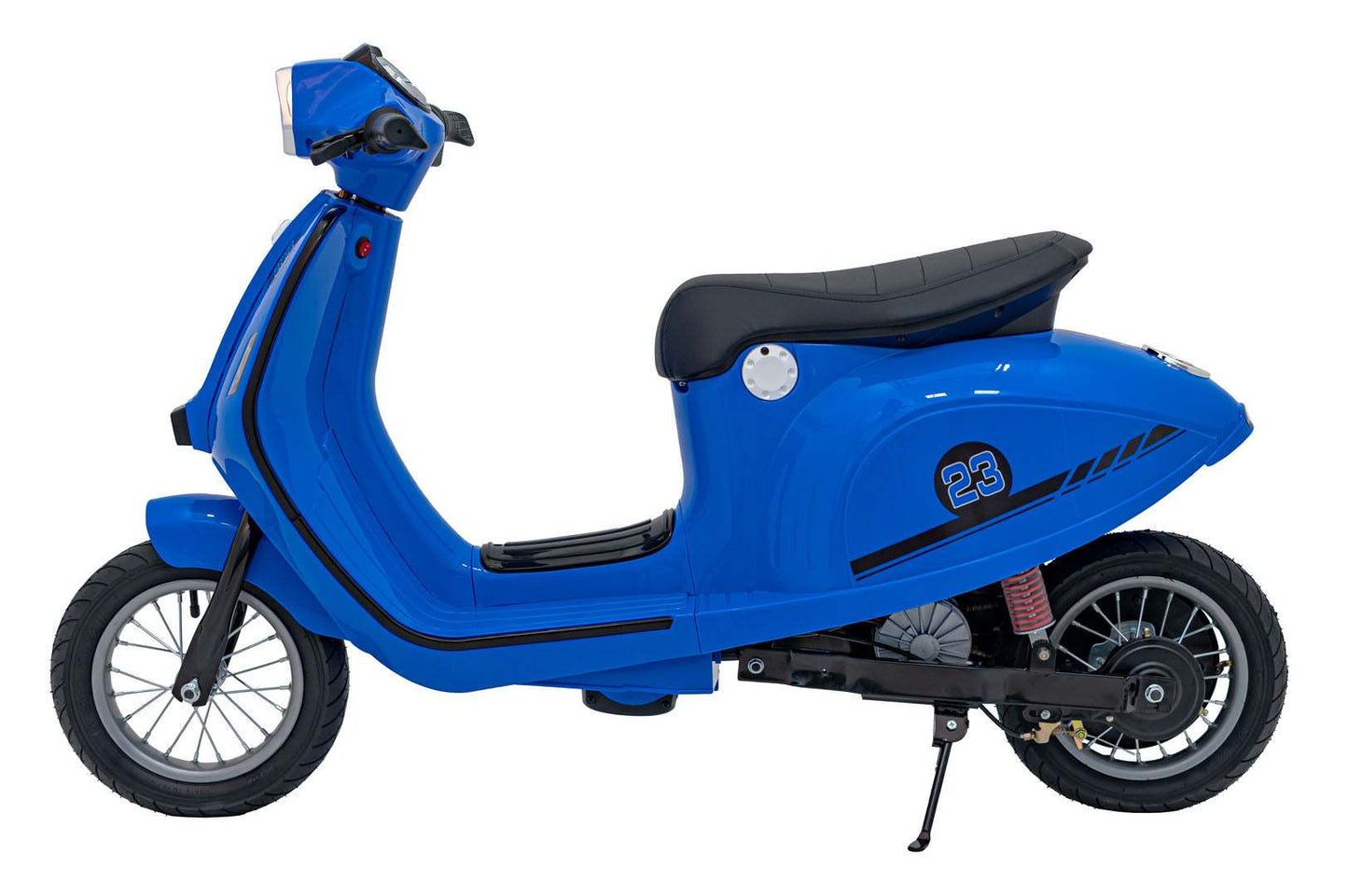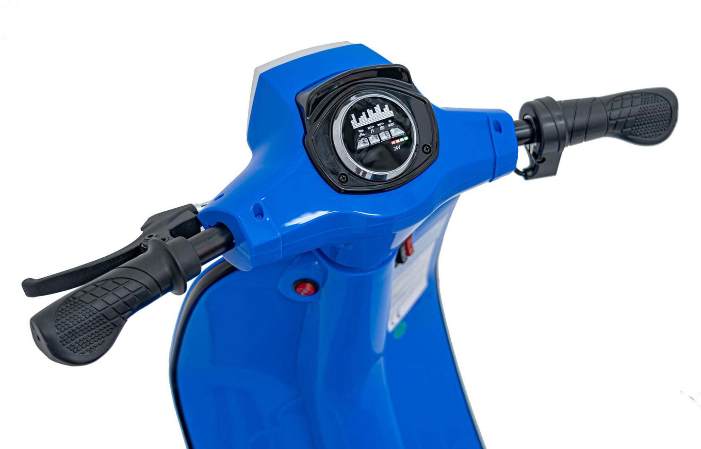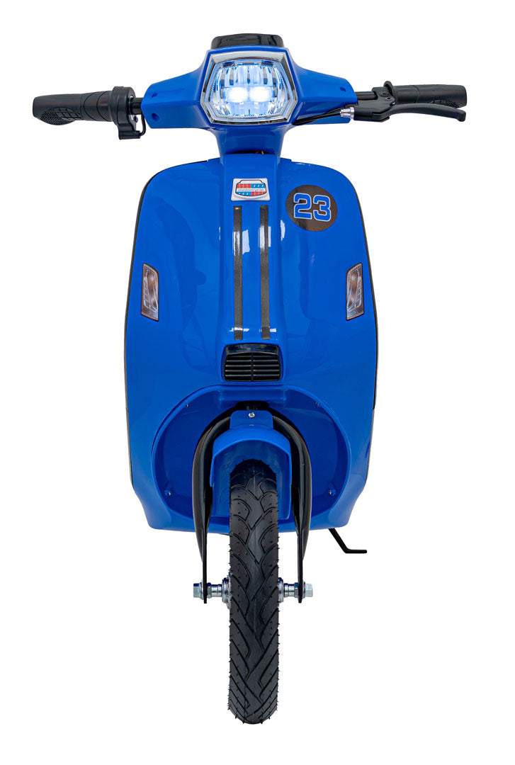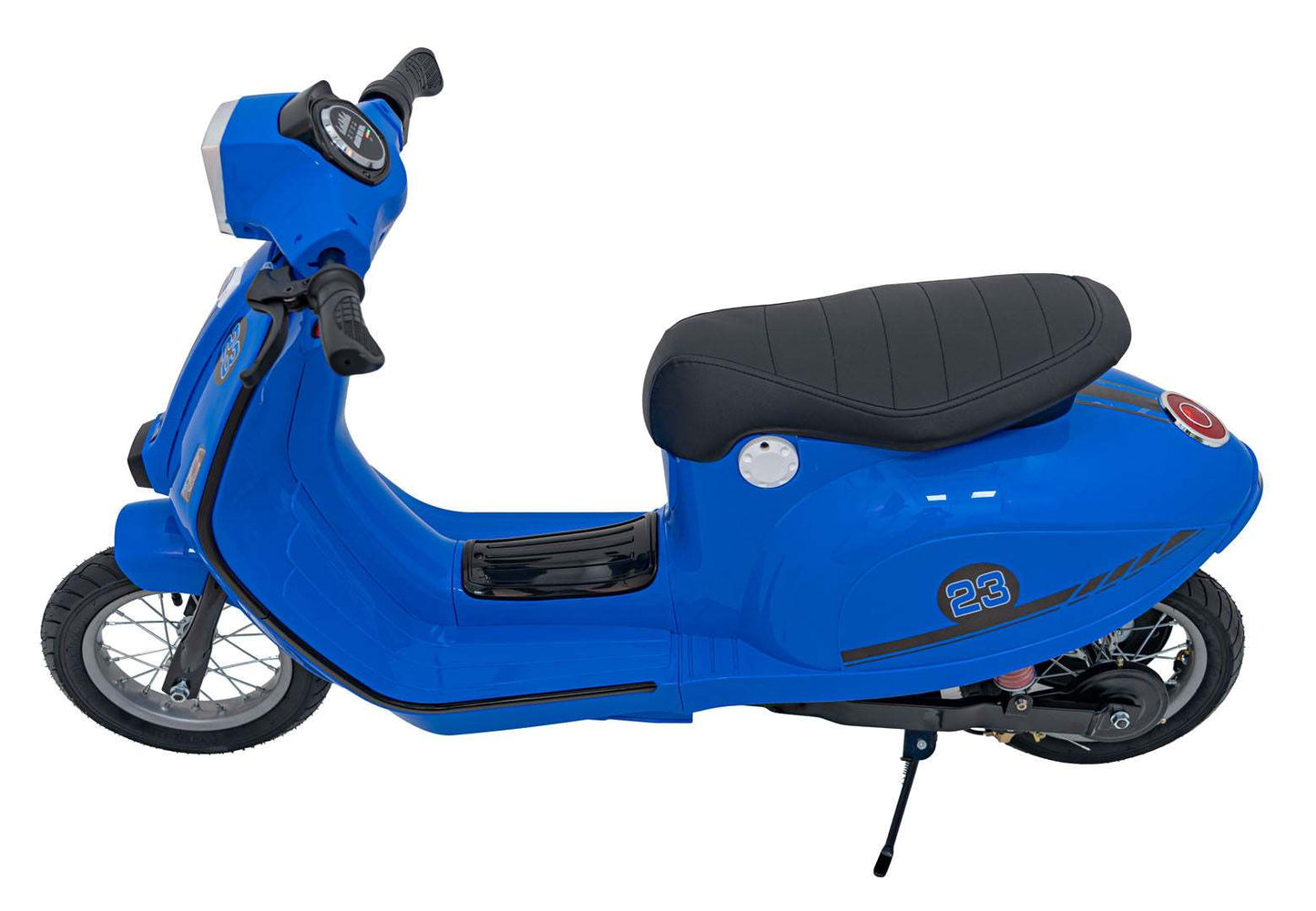 Pojazd Skuter Retro 23 Niebieski to stylowy i kompaktowy skuter elektryczny, idealny do miejskich podróży. Klasyczny, retro design łączy się tu z nowoczesną technologią, zapewniając wygodną i bezpieczną jazdę.