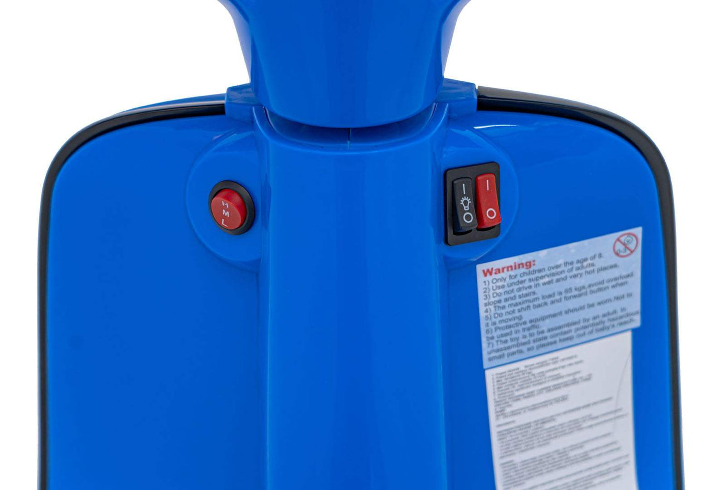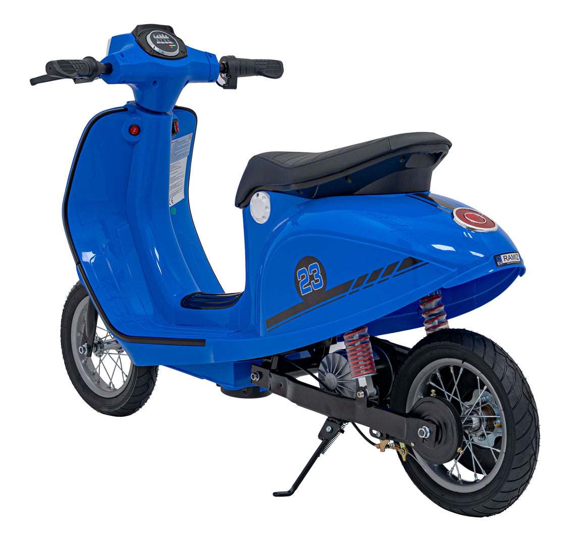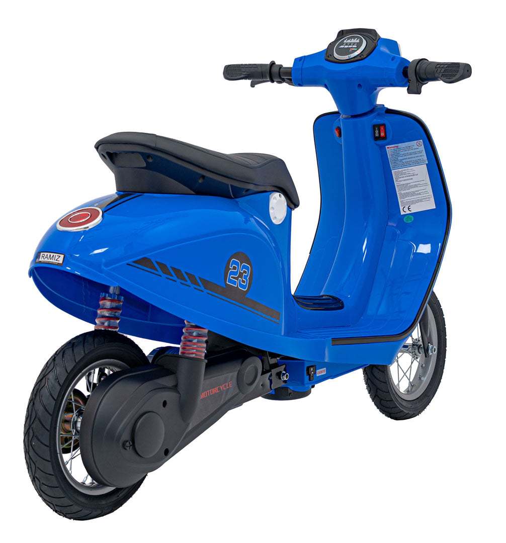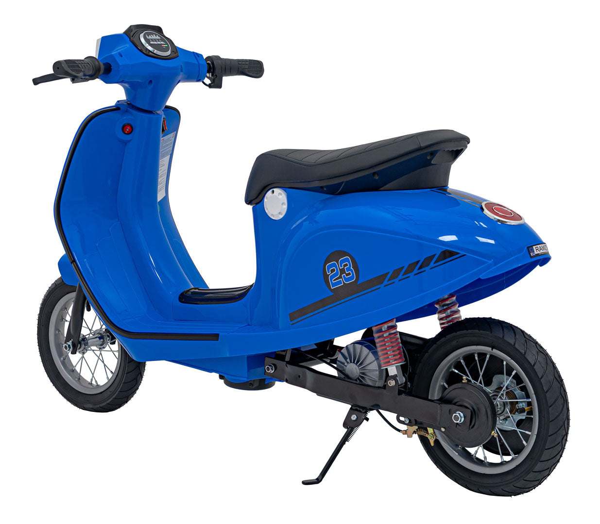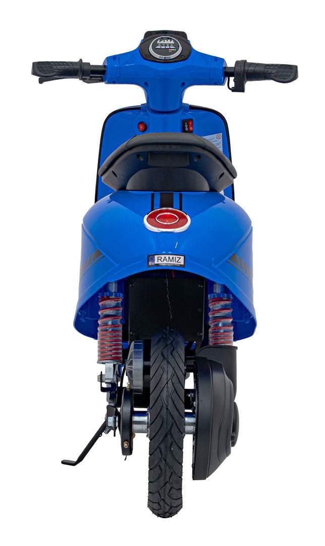 Pojazd Skuter Retro 23 Niebieski to stylowy i kompaktowy skuter elektryczny, idealny do miejskich podróży. Klasyczny, retro design łączy się tu z nowoczesną technologią, zapewniając wygodną i bezpieczną jazdę.