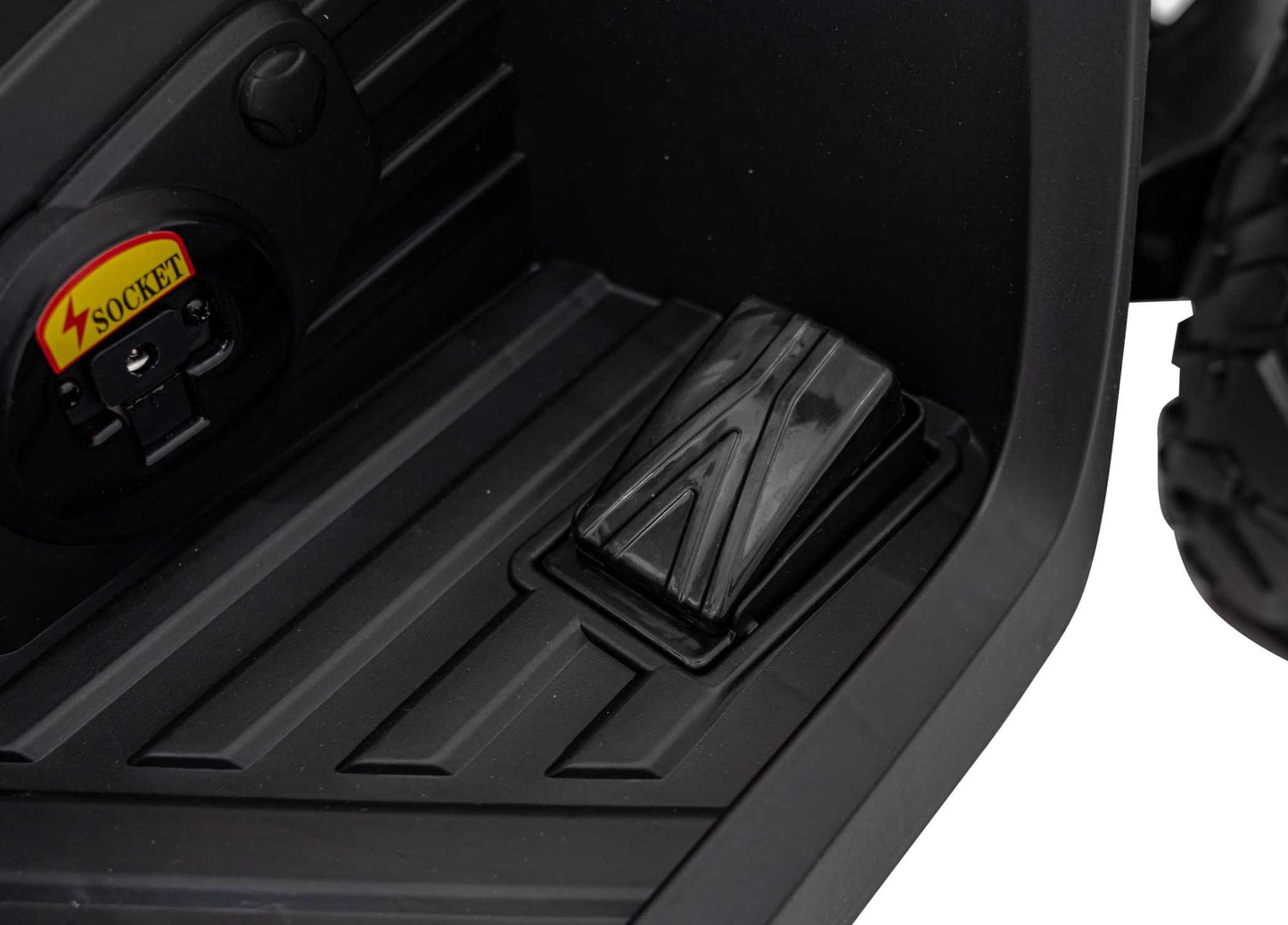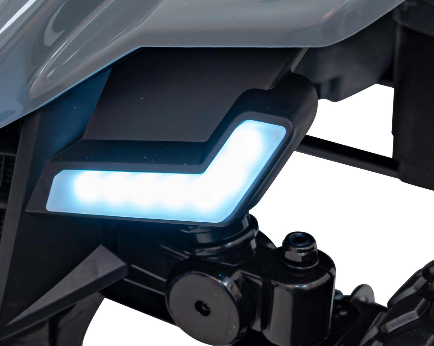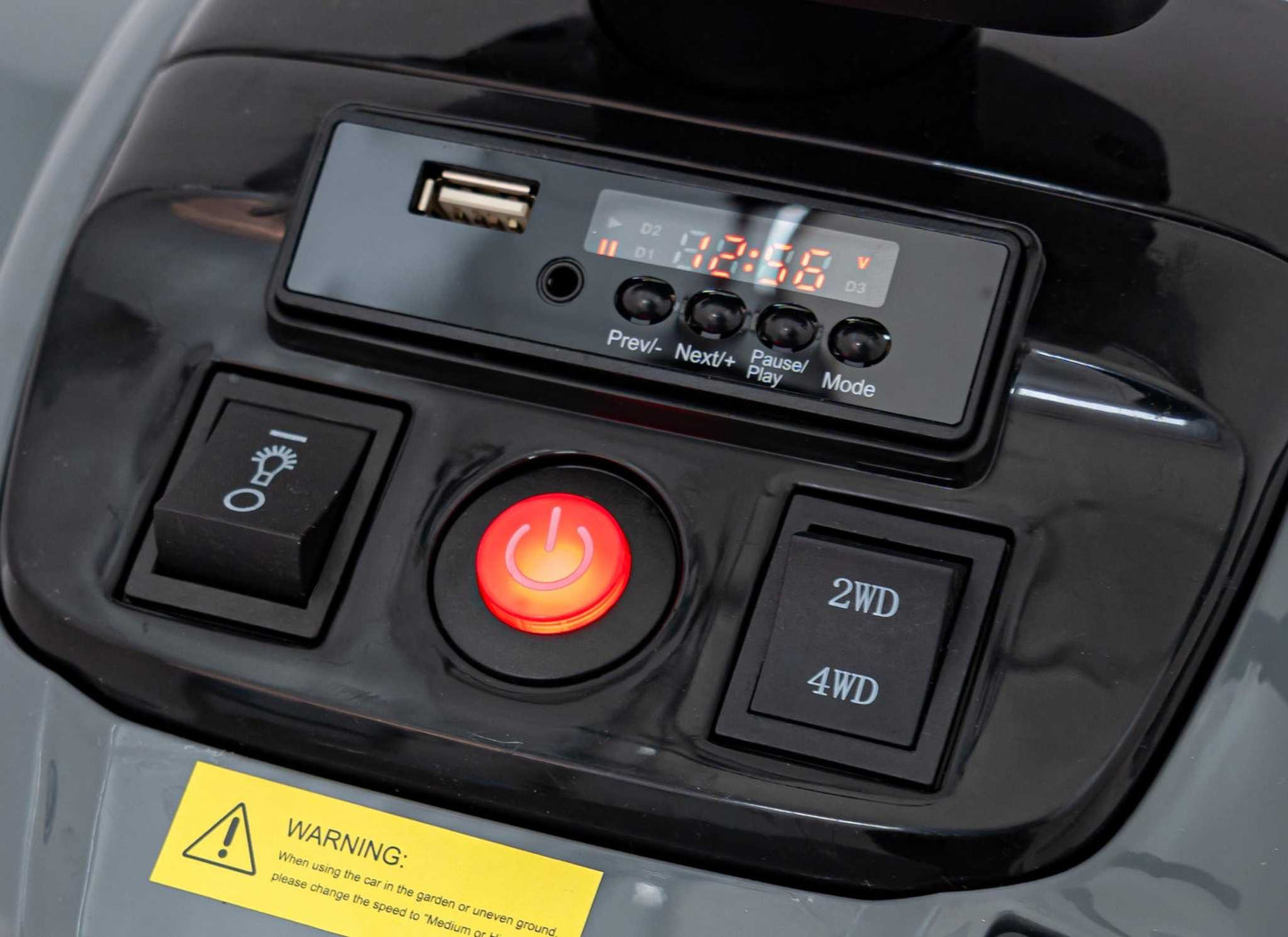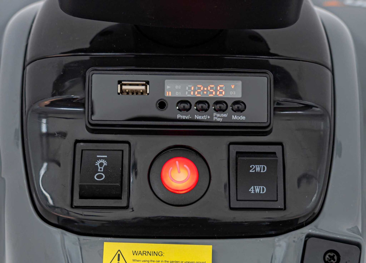 - Podnosi widoczność i radość z zabawy dzięki LED-owym światłom oraz panelowi MP3 z wgranymi melodyjkami (USB/AUX).