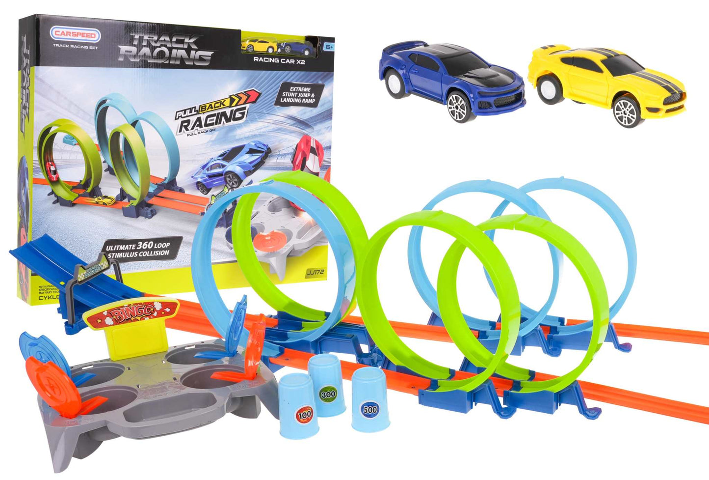 Podwójny tor wyścigowy z pętlami 360 stopni oraz dwoma samochodzikami w zestawie to propozycja dla dzieci od szóstego roku życia. Dzięki swojej konstrukcji równocześnie bawić nim może się dwójka dzieci.