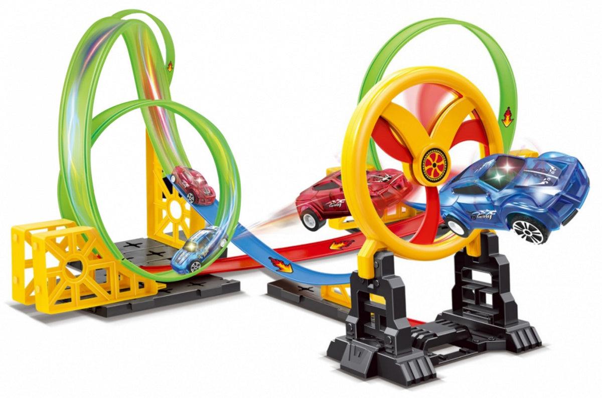 Tor wyścigowy dla dzieci 3+ z ruchomą obręczą, 2 autkami LED i 3 pętlami 360°