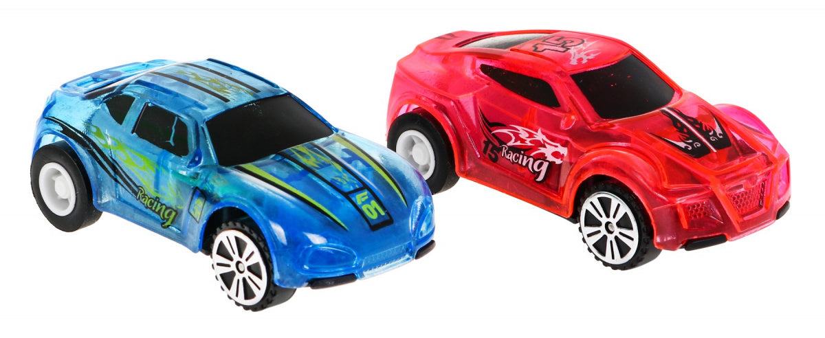 - Dwa samochodziki LED zasilane bateriami 3 x AG13 (w zestawie) z napędem i oświetleniem LED.