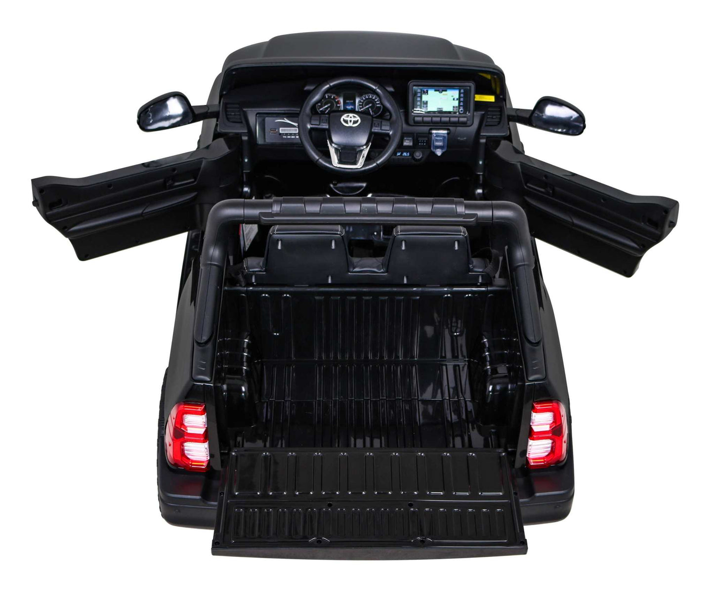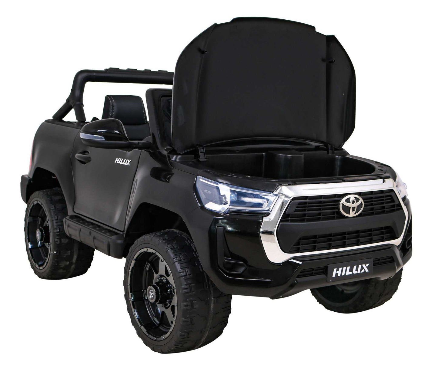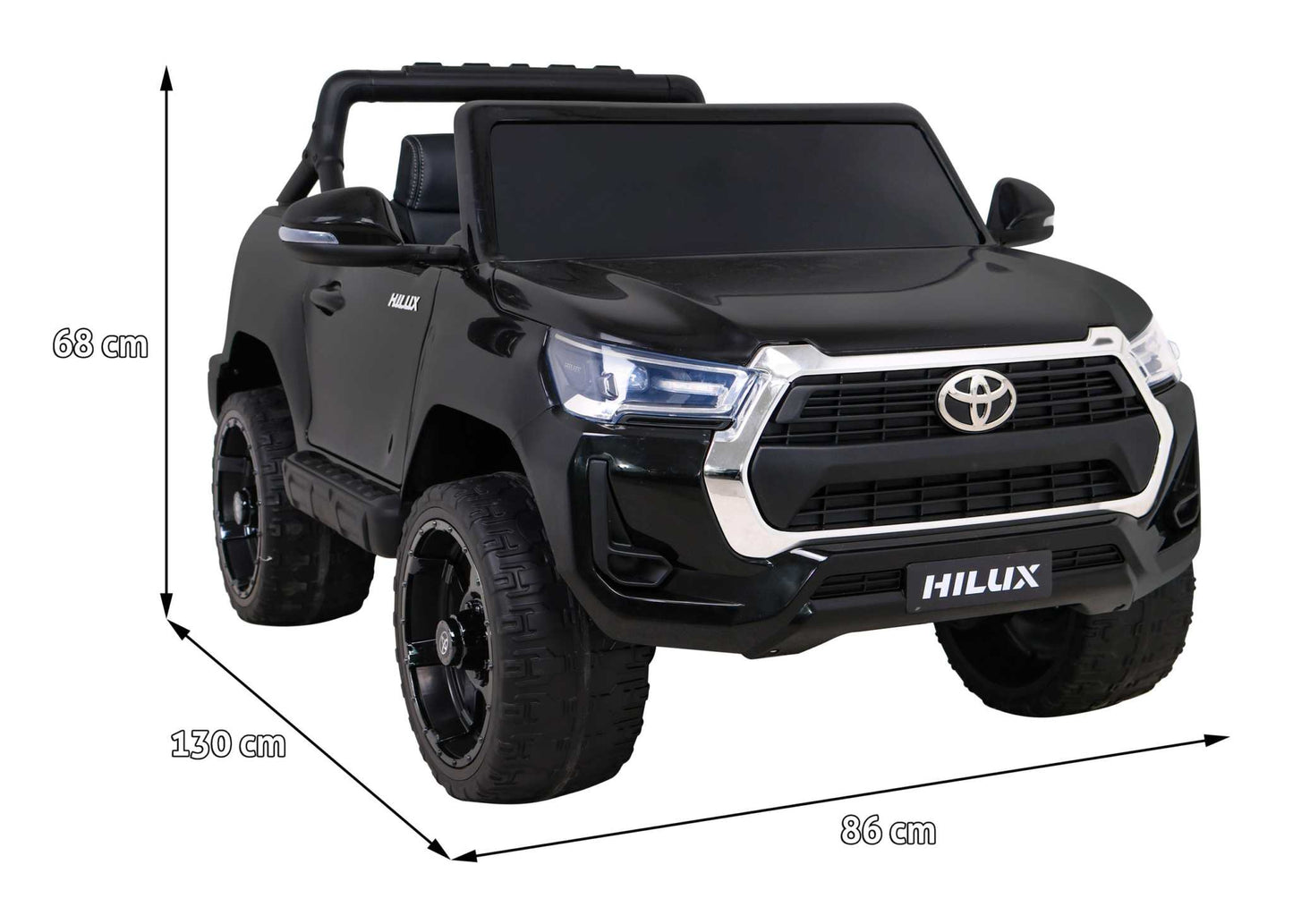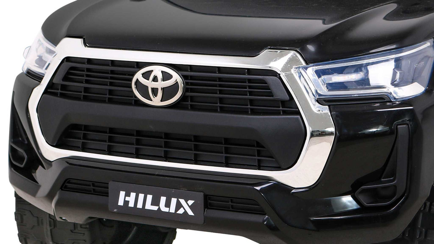 Przyjazny początkującym kierowcom, realistyczny toyota hilux na akumulator dla dzieci. Czarny kolor, napęd 4x4 i zestaw funkcji zapewniają godziny radości w ogrodzie lub na podwórku.