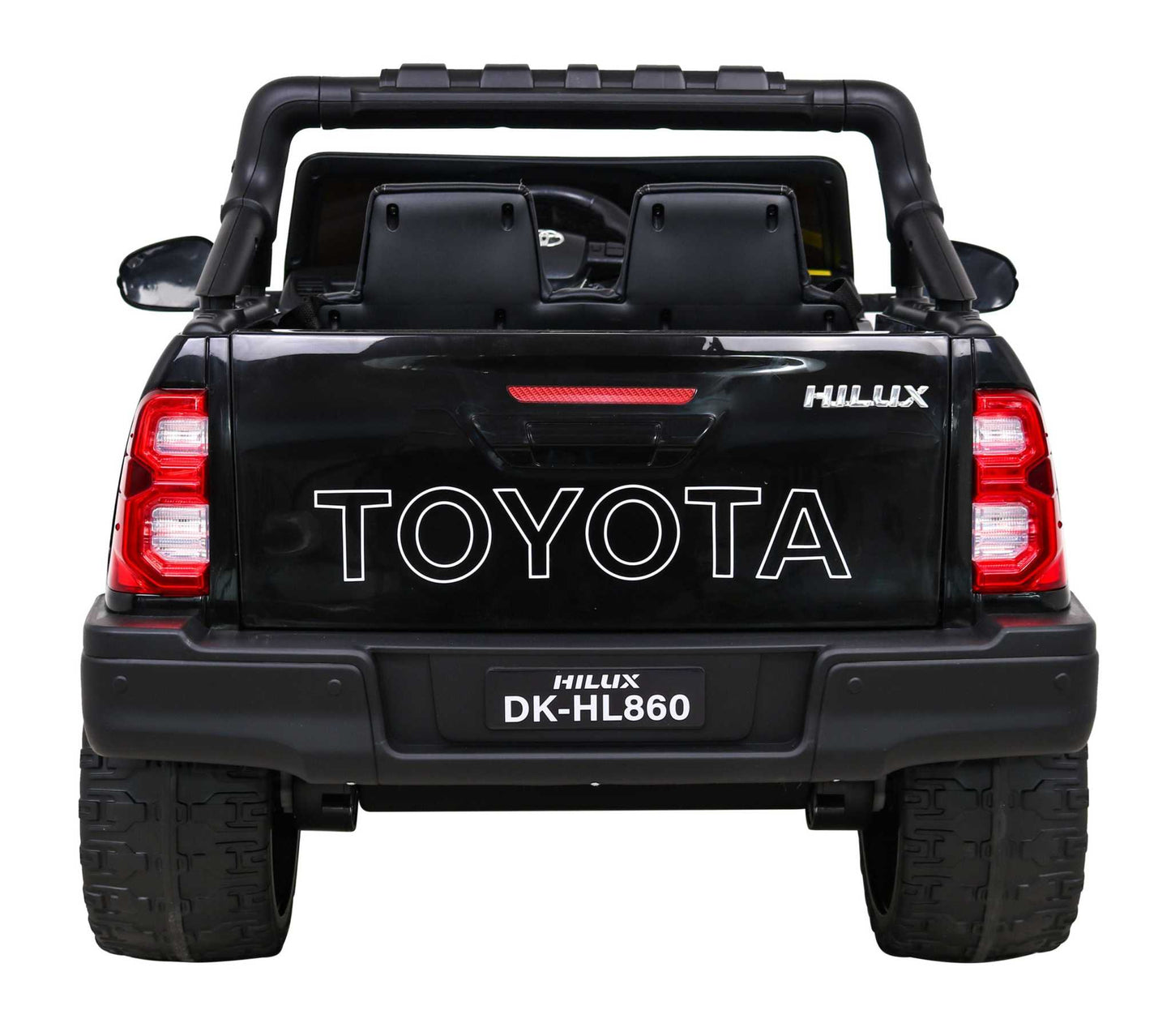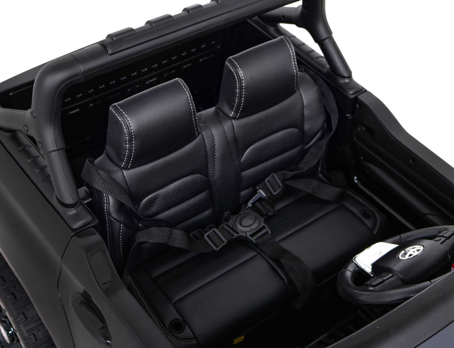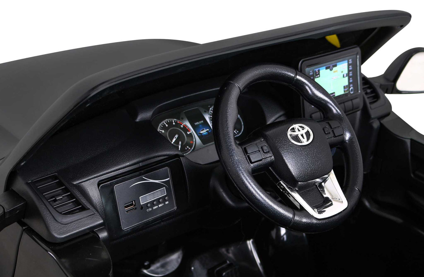 Przyjazny początkującym kierowcom, realistyczny toyota hilux na akumulator dla dzieci. Czarny kolor, napęd 4x4 i zestaw funkcji zapewniają godziny radości w ogrodzie lub na podwórku.