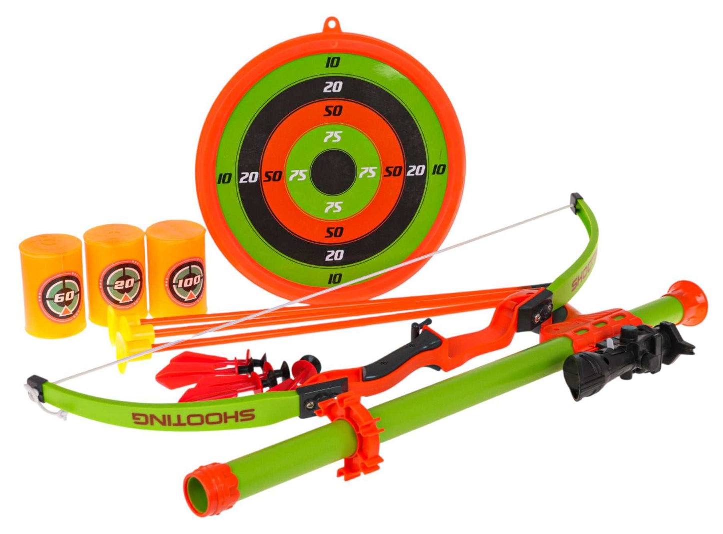 - Kompletny zestaw akcesoriów – strzały do łuku, strzałki do pistoletu, tarcza oraz beczułki.
