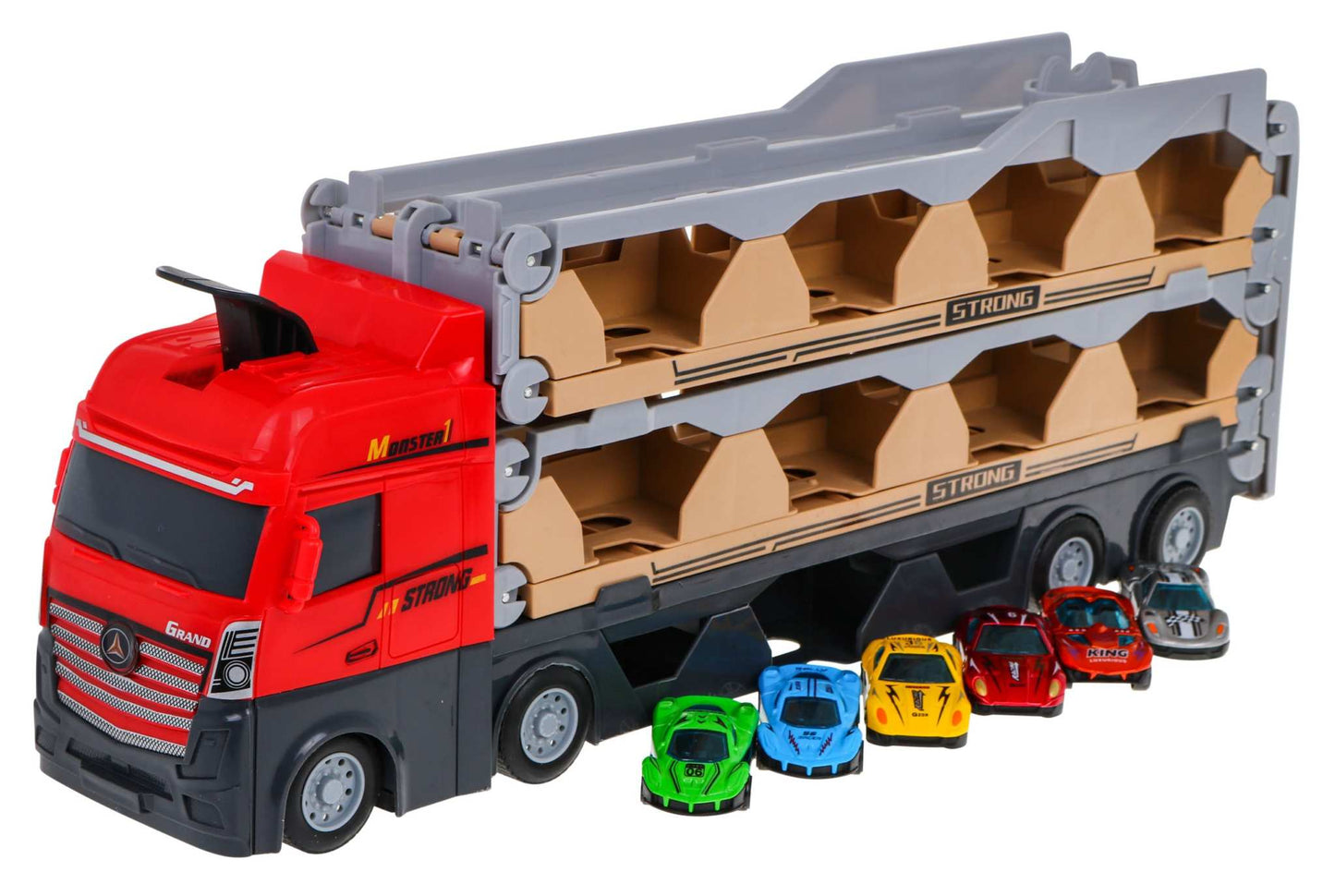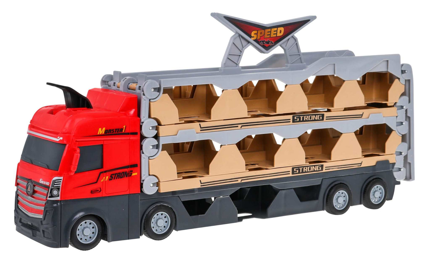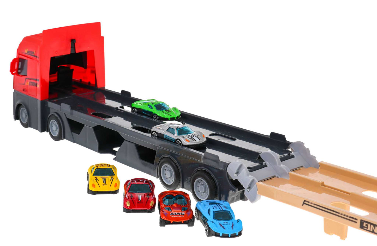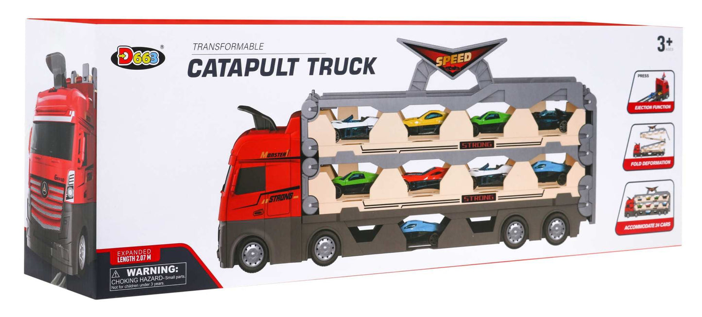 - Trzypoziomowy design — duża ciężarówka z lawetą oferuje trzy poziomy zabawy, po których dzieci mogą manewrować autkami i korzystać z toru z katapultą.