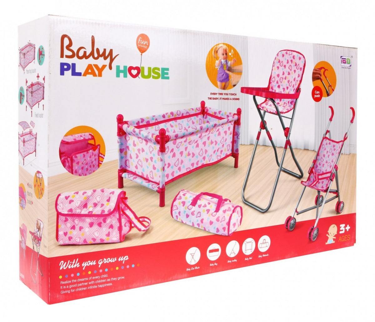 Zestaw akcesoriów do lalek dla dzieci 3+ Opieka nad niemowlakami + Wózek + Krzesełko do karmienia + Łóżeczko + 2 torby