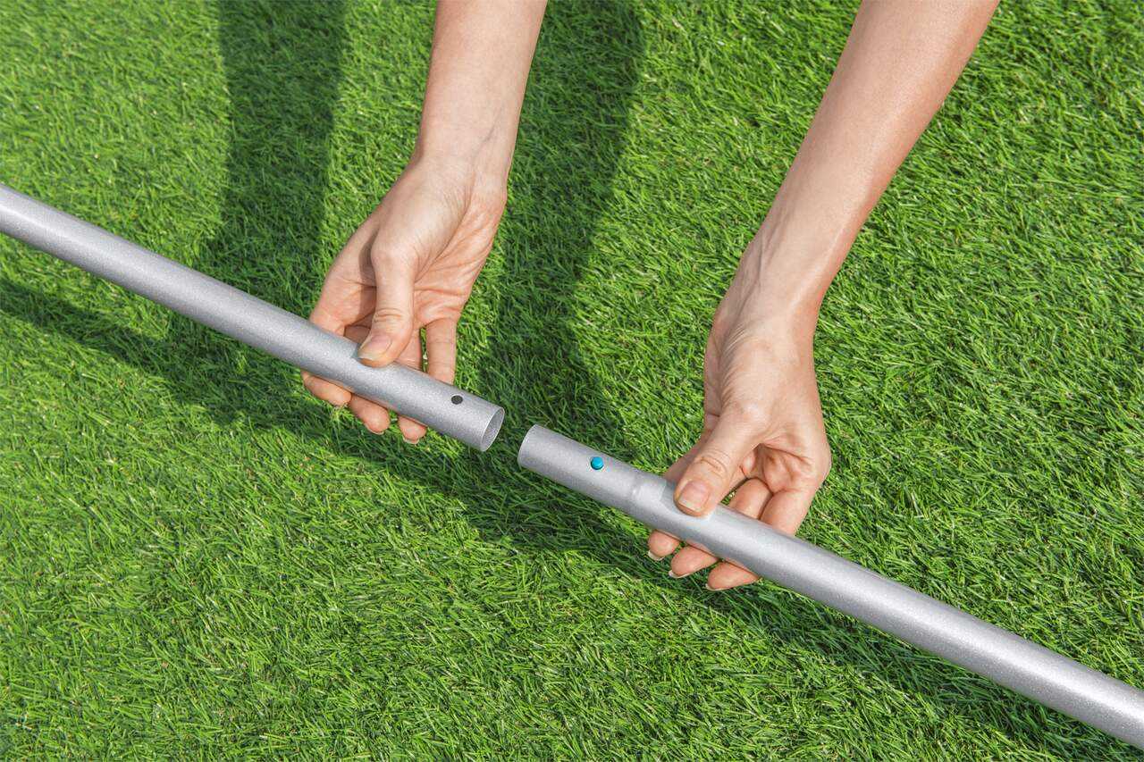 - Ma niską wagę zestawu 1,53 kg, co ułatwia przenoszenie i przechowywanie po sezonie.