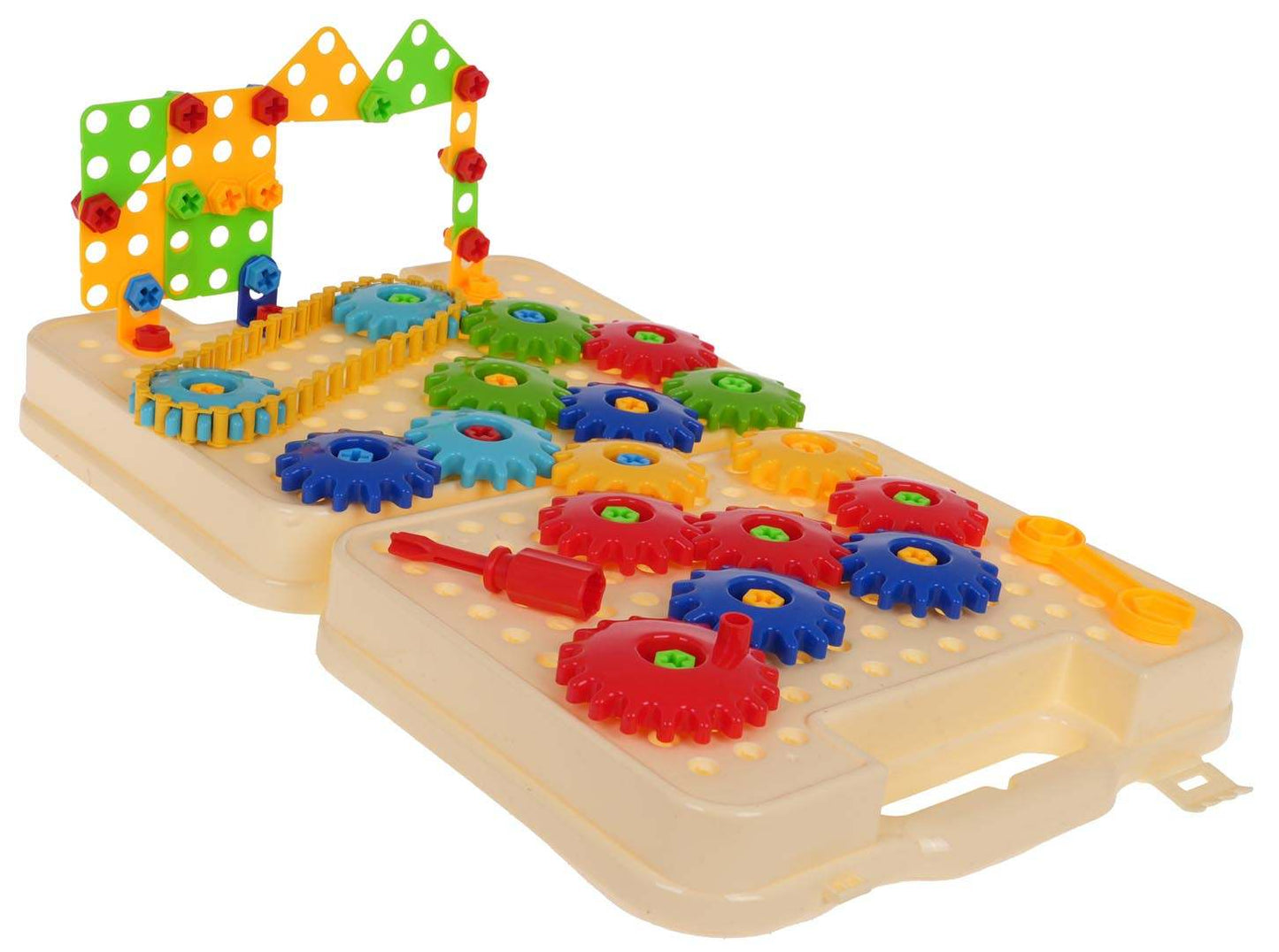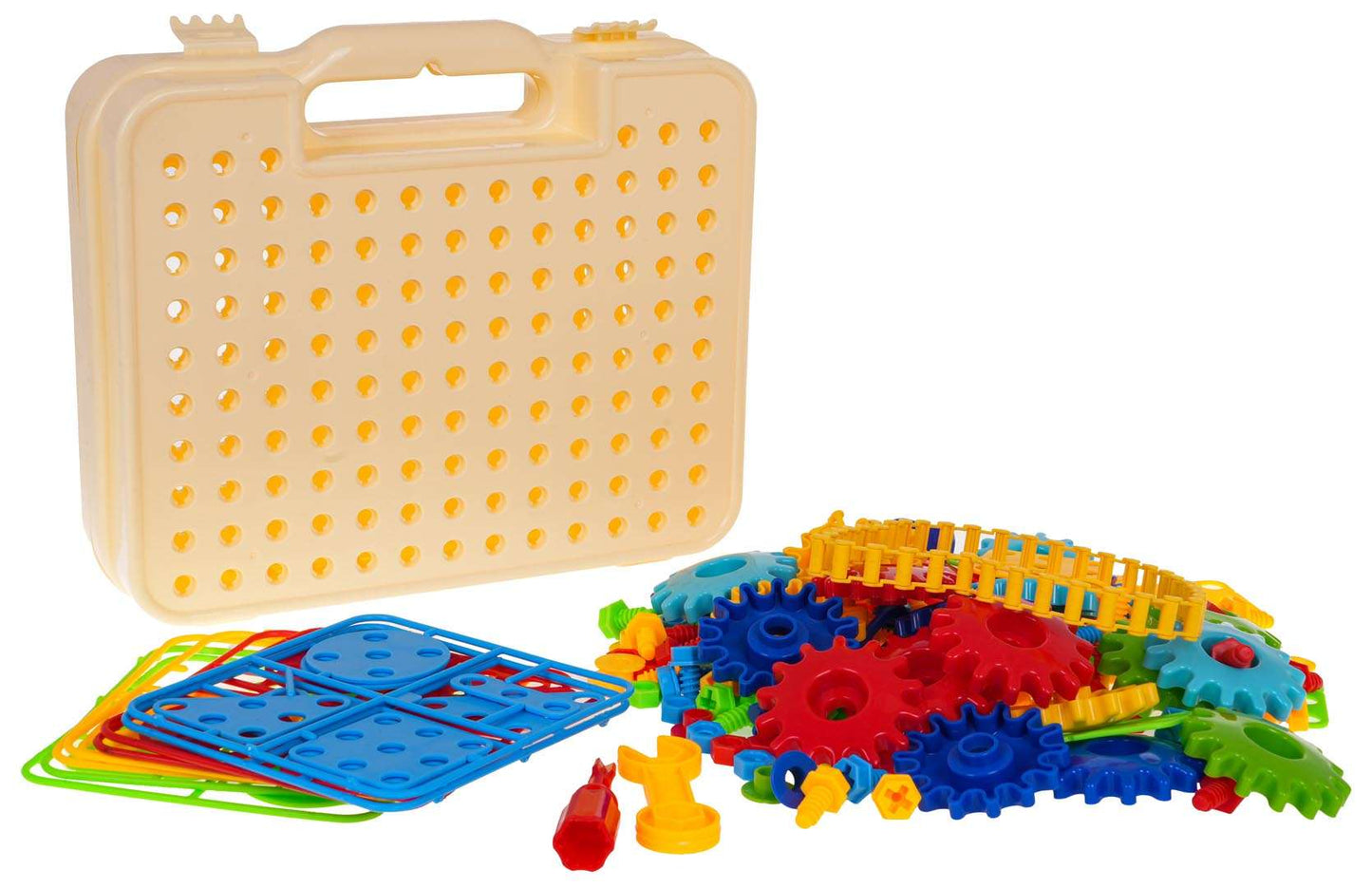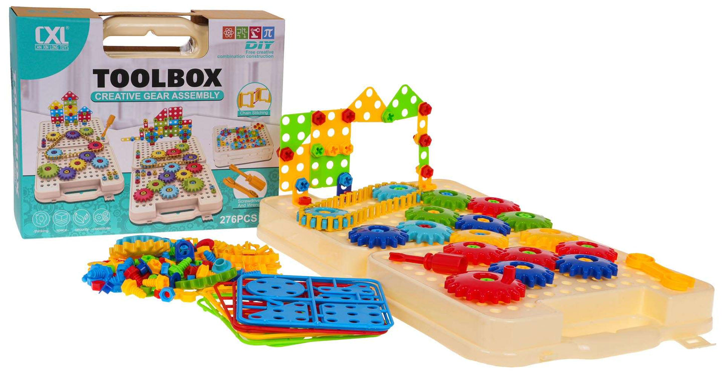 Zestaw DIY 276el to zestaw inżynierski dla małego konstruktora od 3-go roku życia. Zawiera rozkładaną walizkę, koła zębate, klocki i narzędzia — wszystko, co potrzebne do tworzenia własnych przekładni i mechanizmów.