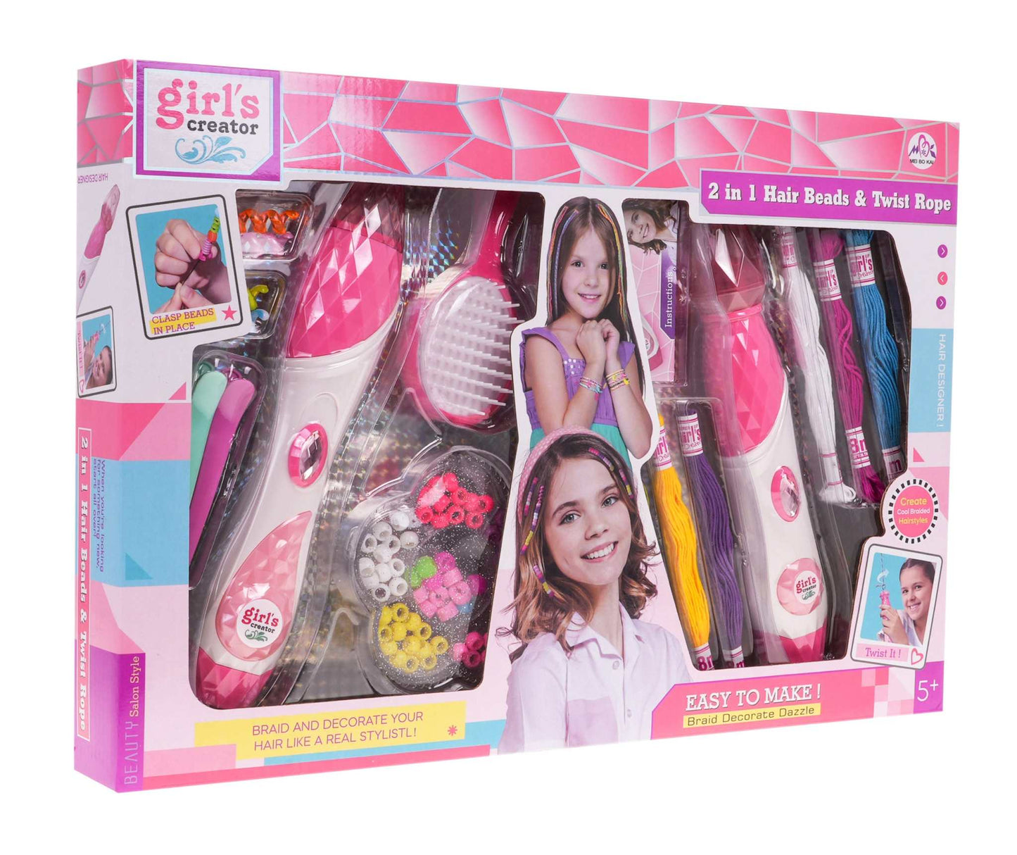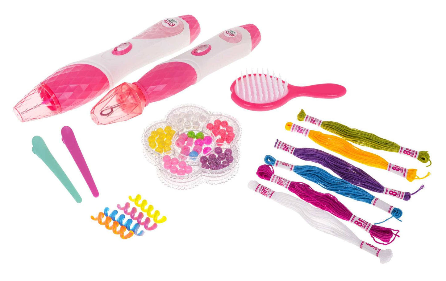 - Dwa urządzenia do stylizacji – maszynka do aplikacji koralików nie wymaga baterii, a maszynka do zaplatania warkoczy wykorzystuje mulinę.