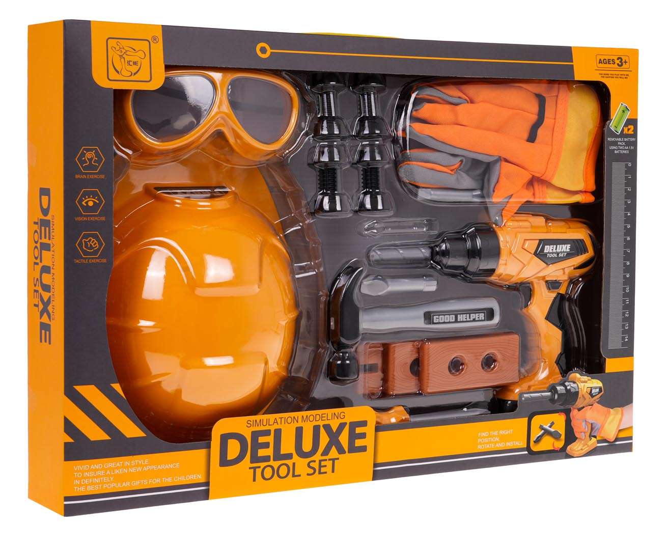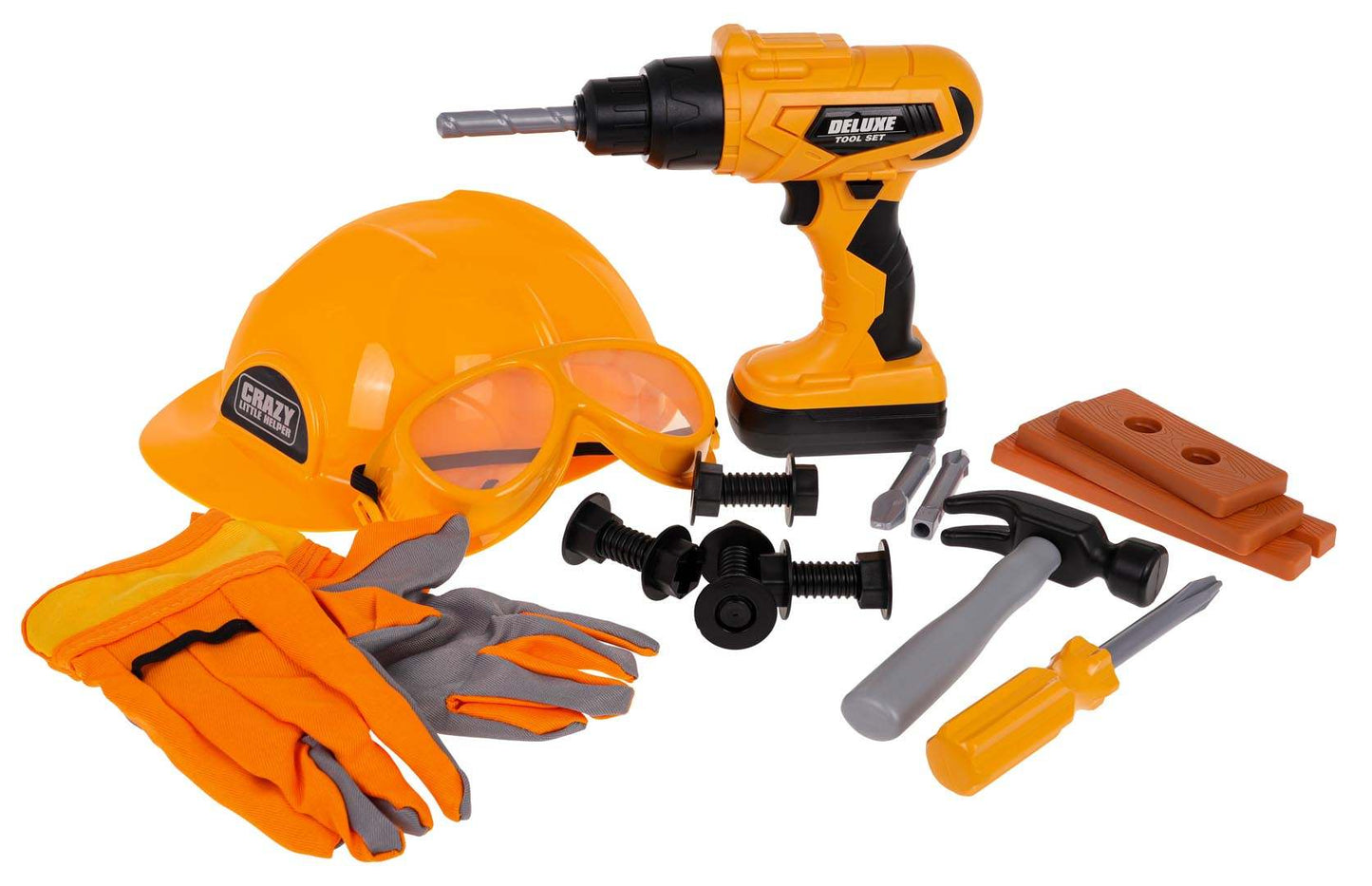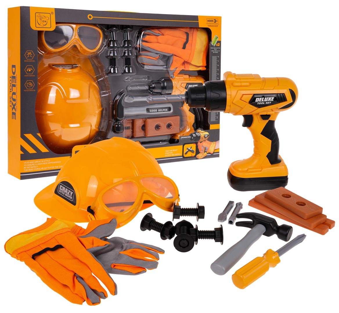 - 20 elementów zestawu — w tym kask, rękawiczki, śrubokręt, młotek, okulary ochronne i inne akcesoria.