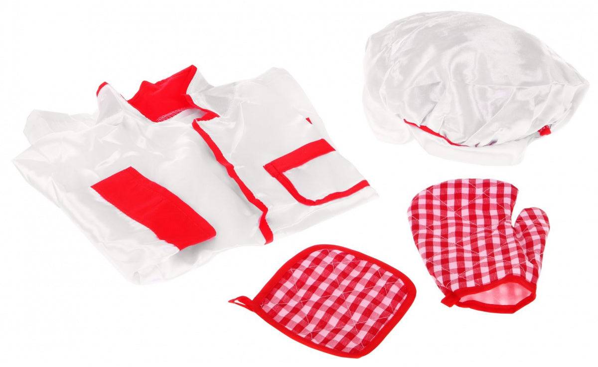 Przeznaczony dla dzieci 3+. Metalowa konstrukcja zapewnia trwałość; zabawa powinna odbywać się pod nadzorem dorosłych. Zestaw zawiera strój kucharza, fartuch i rękawicę, które dodają autentyczności, bez zastępowania prawdziwych narzędzi kuchennych.